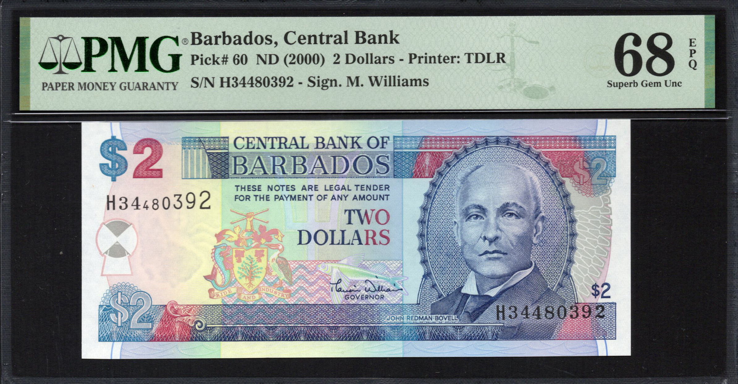 Le recto du billet de 2 $ affiche un portrait coloré de John Redman Bovell, une figure prédominante de l'histoire barbadoise. L'arrière-plan présente un mélange de nuances de bleu et de rose, avec des designs ornementaux incluant les armoiries de la Barbade et de l'impression de microtexte pour la sécurité. Le montant est clairement indiqué, et divers éléments de sécurité, tels qu'un filigrane et une bande holographique, renforcent l'intégrité du billet. Le design reflète à la fois des valeurs artistiques et une sécurité pratique, le rendant visuellement attrayant et difficile à contrefaire.