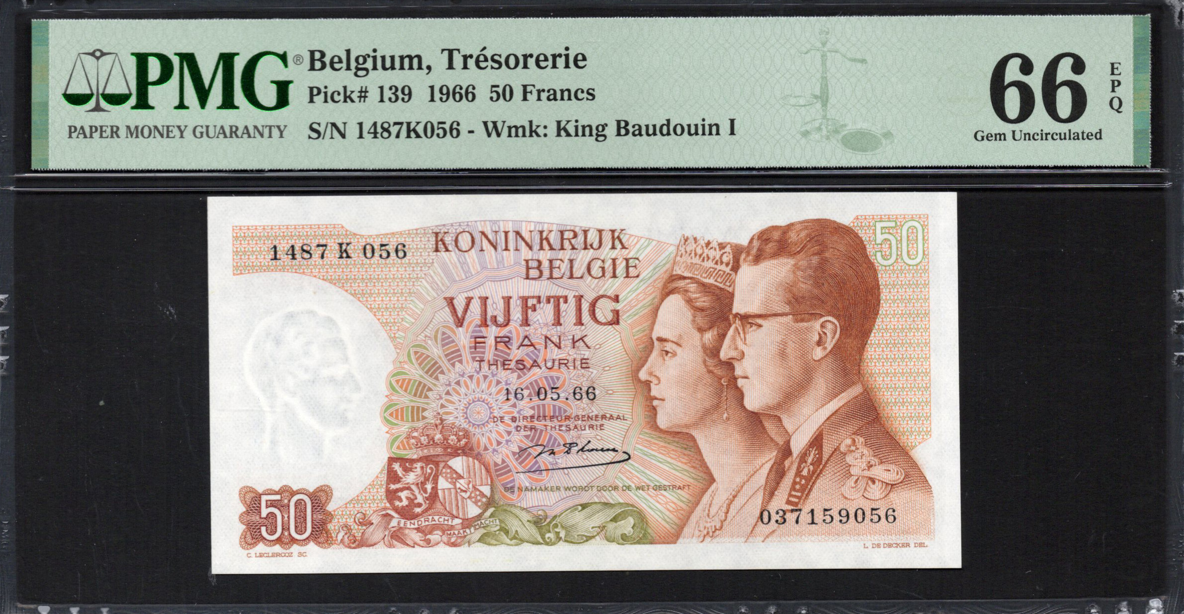 Le recto du billet de 50 Francs présente un portrait du roi Baudouin I, accompagné d'un design élaboré comprenant des détails ornementaux et des motifs complexes. La palette de couleurs privilégie des tons d'orange et de beige clair, offrant une apparence chaleureuse et accueillante. De plus, des caractéristiques de sécurité telles qu'un filigrane du profil du roi sont visibles lorsque le billet est maintenu à la lumière, garantissant ainsi son authenticité. L'année 1966 est affichée de manière proéminente, aux côtés de la dénomination, créant une composition équilibrée qui met en avant l'importance du billet.