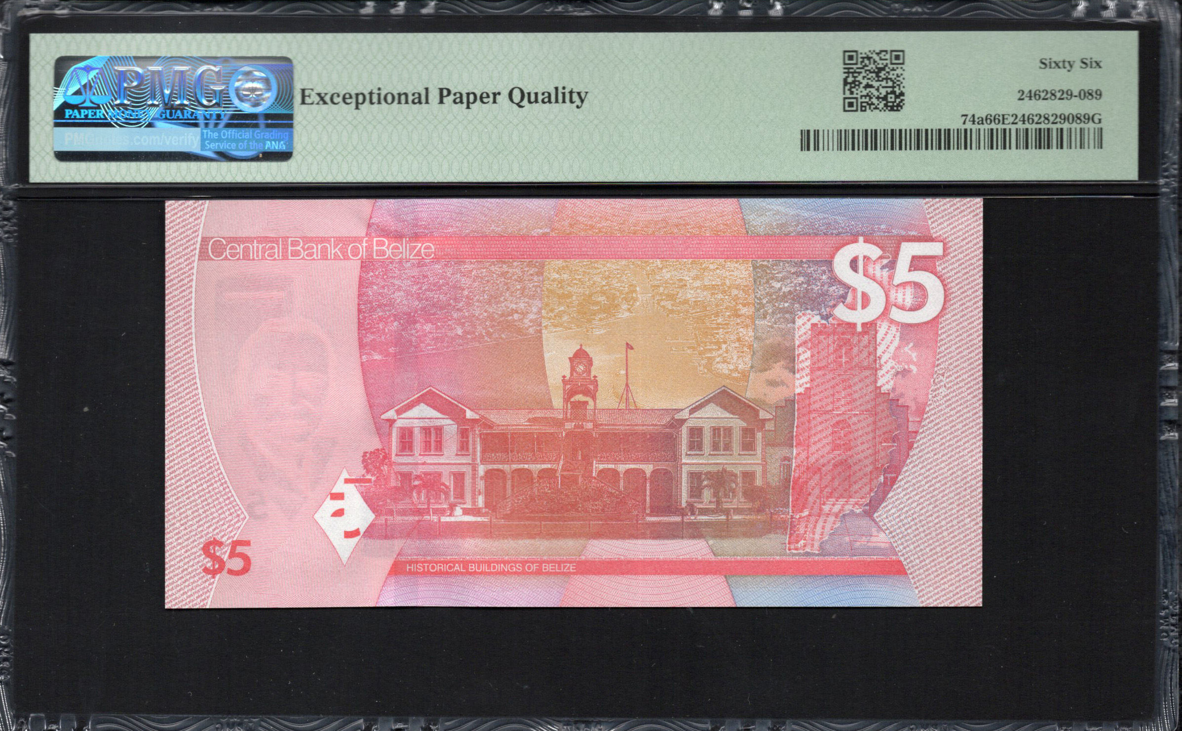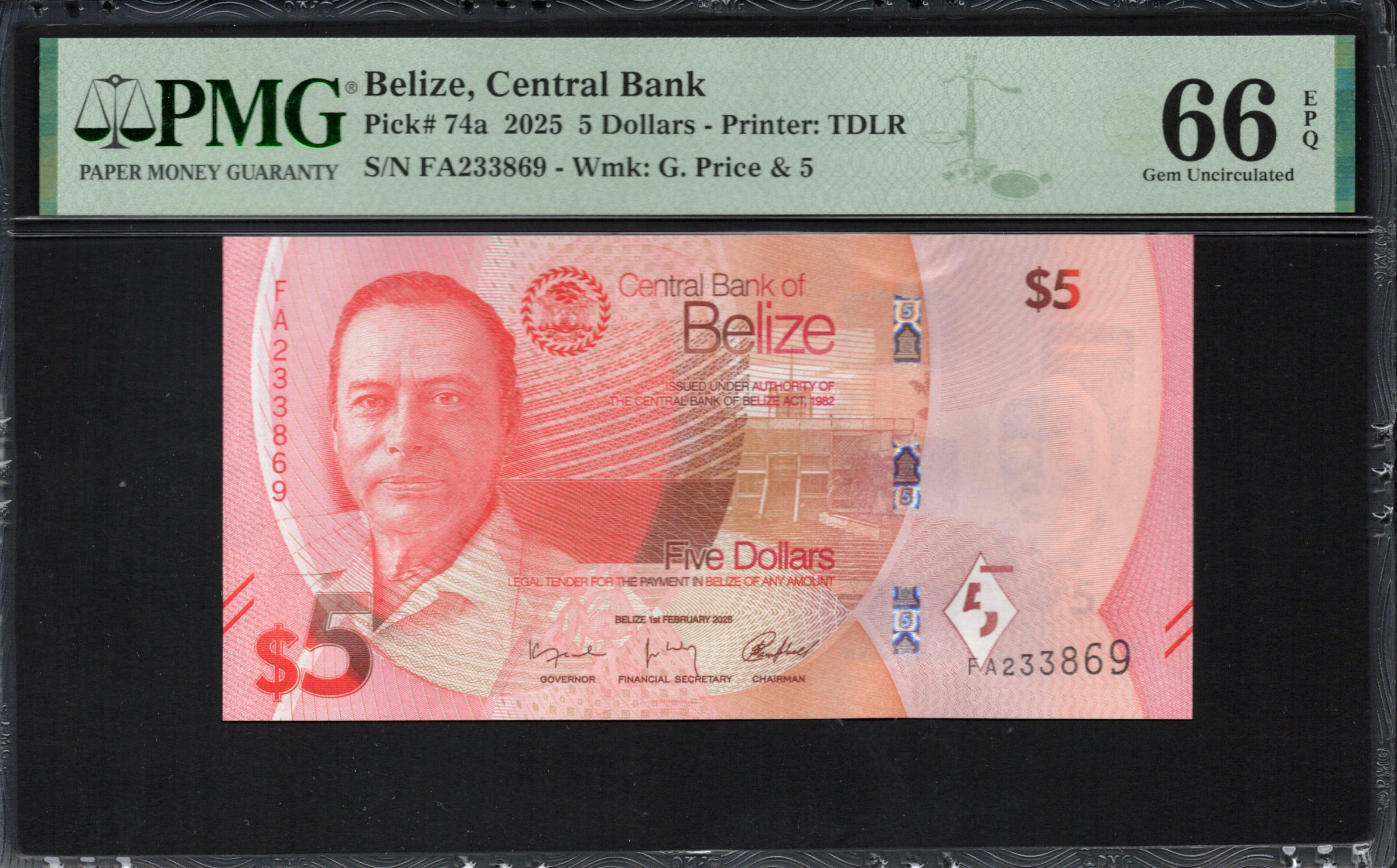 Le recto du billet de cinq dollars du Belize montre en évidence le portrait d'une personnalité distinguée, représentant le leadership belizien. L'arrière-plan présente des motifs complexes et des éléments associés à la culture du pays, y compris divers symboles nationaux. L'utilisation prédominante de teintes rouges et roses ajoute une touche vibrante, tandis qu'un filigrane améliore la sécurité et l'authenticité. Des micro-textes supplémentaires et une caractéristique holographique peuvent également être présents, ajoutant à la complexité et à la sécurité du billet contre la contrefaçon.