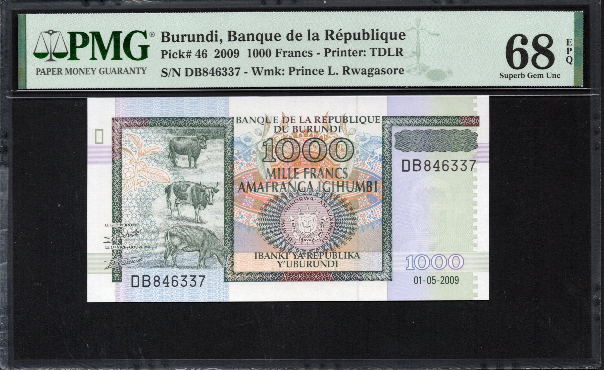 Le billet de 1000 Francs du Burundi est un élément de monnaie vibrant qui reflète le riche patrimoine culturel du pays. Doté de conceptions complexes, il met en avant la faune locale et des symboles historiques qui représentent l'identité du Burundi. Le recto présente de manière saisissante une paire de vaches, soulignant l'importance agricole du bétail dans la culture burundaise. Le verso met en valeur des motifs décoratifs et le montant, consolidant sa valeur. Divers éléments de sécurité peuvent être observés, notamment des filigranes et des micro-textes qui vérifient l'authenticité, rendant le billet résistant à la contrefaçon. Ce billet sert non seulement de monnaie légale, mais aussi de toiles racontant l'histoire du Burundi.