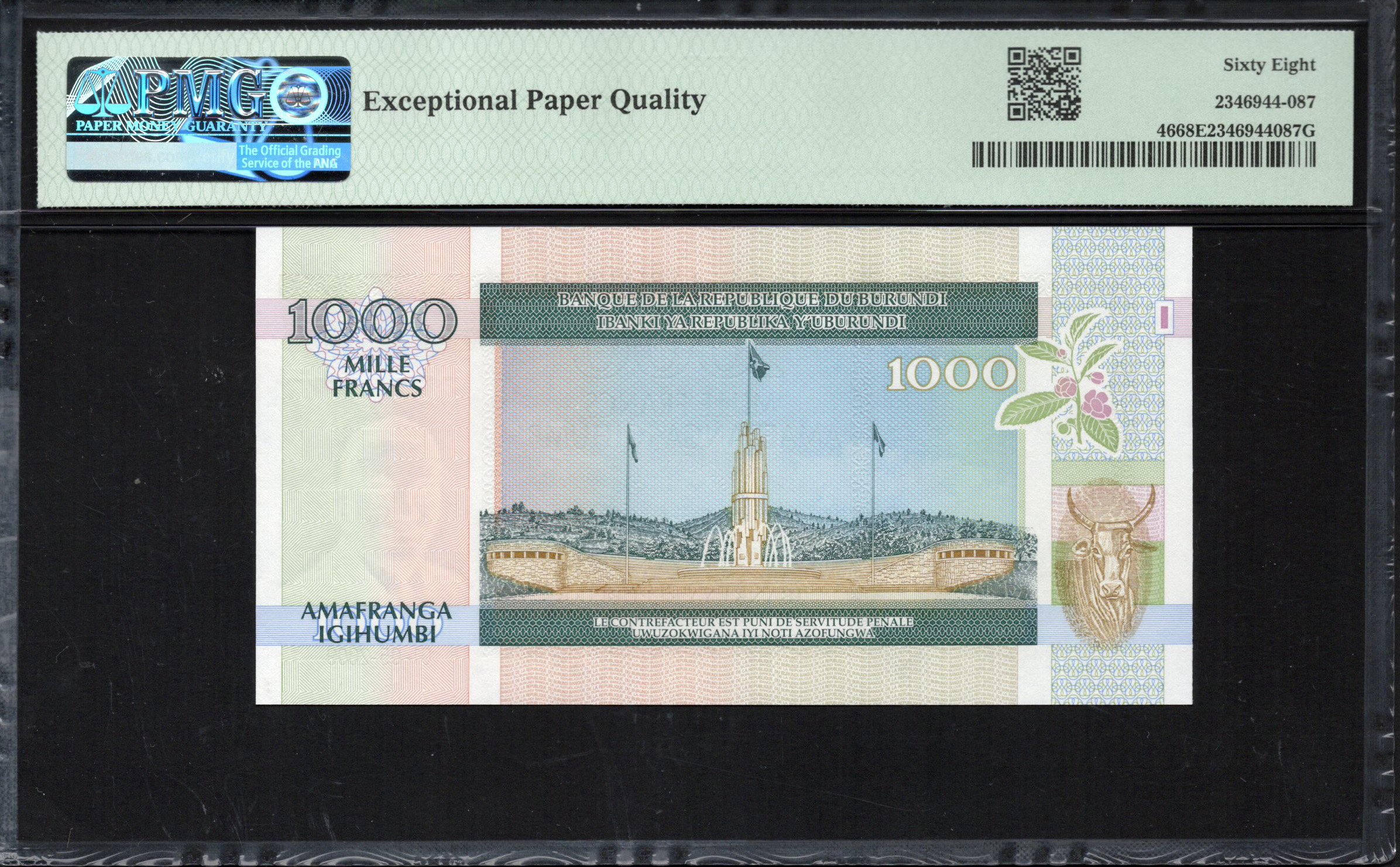 Au verso, le billet poursuit son récit artistique avec des motifs élaborés et le montant à nouveau affiché de manière proéminente. Un élément de sécurité distinct, tel qu'un microtexte ou un hologramme, peut souvent y être trouvé, fournissant un niveau supplémentaire de protection contre la contrefaçon. L'arrière-plan est orné de conceptions détaillées qui reflètent les motifs culturels burundais, augmentant la complexité visuelle du billet. Ce mélange unique de couleurs et de motifs n'agit pas seulement comme un outil de vérification, mais aussi comme une célébration de l'art et du patrimoine burundais.