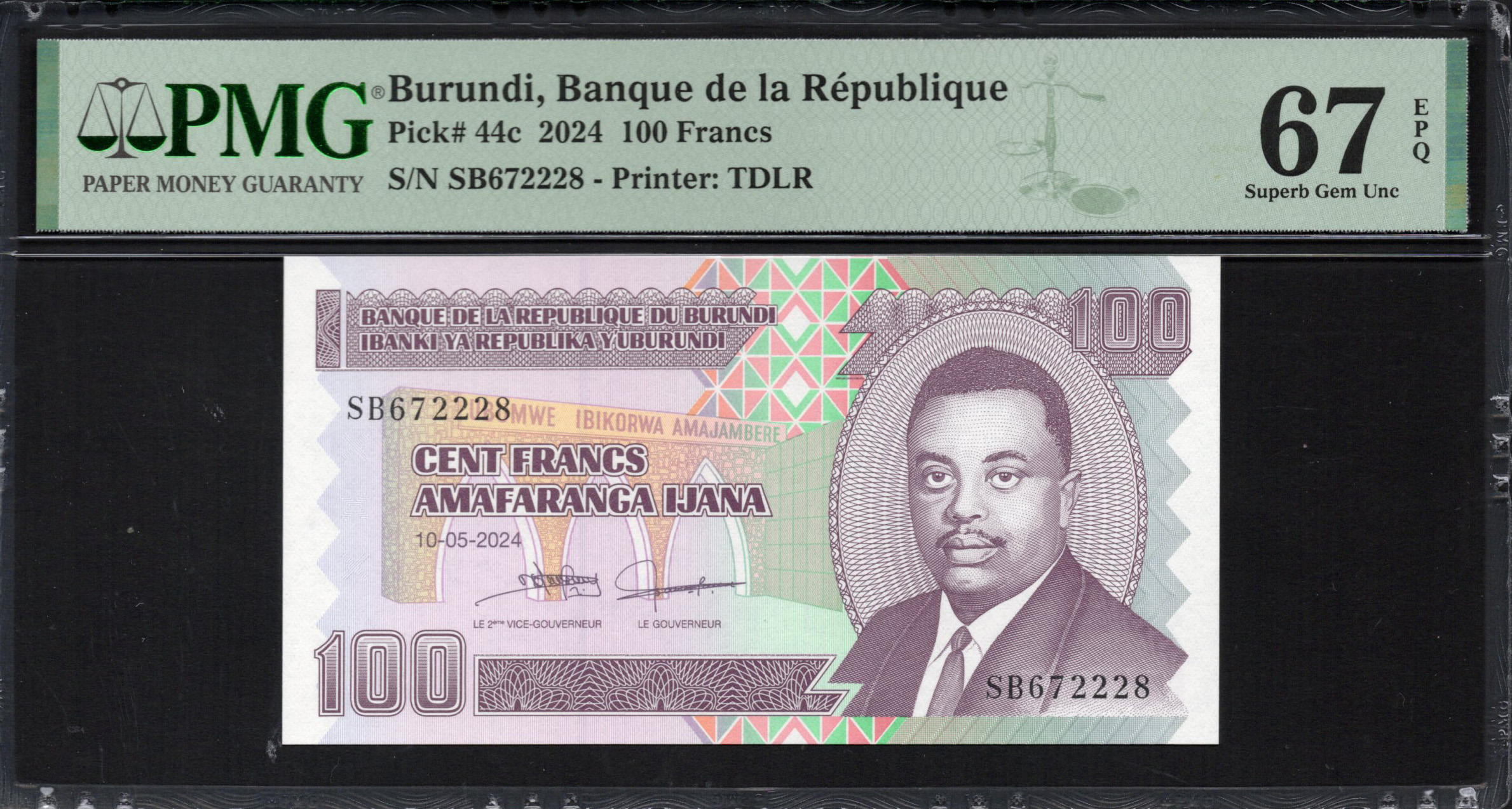 Le billet de 100 Francs du Burundi, émis en 2024, présente un design vibrant qui met en avant le patrimoine culturel et les valeurs du pays. Ce billet intègre des éléments de sécurité notables, agissant à la fois comme une œuvre d'art et un moyen d'échange. L'avers présente un portrait marquant, symbolisant le leadership et le progrès, contrasté par des motifs géométriques représentant la diversité géographique du Burundi. Le revers, riche en motifs colorés, souligne davantage l'identité nationale et offre des éléments de sécurité essentiels tels que des filigranes et de la micro-impression. Ce billet reflète non seulement le système monétaire du Burundi, mais sert également de toile pour l'expression artistique et le récit culturel.