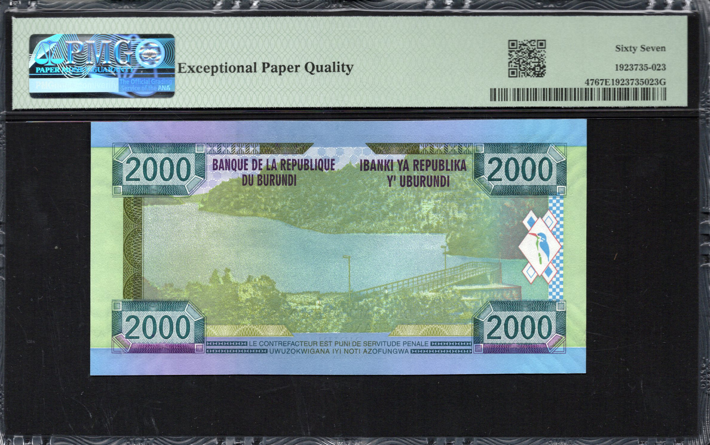 Le billet de 2000 francs burundais est une représentation vivante de la culture et du patrimoine de la nation. Émis par la Banque de la République du Burundi, ce billet arbore des designs complexes et des caractéristiques de sécurité pour garantir son authenticité. Le recto du billet présente la silhouette d'une danseuse entourée de motifs colorés, soulignant les expressions artistiques des traditions burundaises. Le verso met en avant des thèmes agricoles, illustrant les cultures locales et les travailleurs, signifiant l'importance de l'agriculture dans l'économie.
