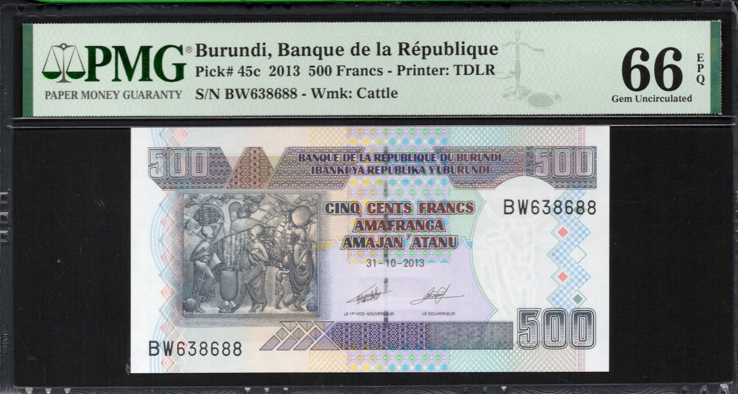 Le billet de 500 francs du Burundi affiche des œuvres d'art saisissantes, symbolisant le patrimoine culturel et la vitalité économique du pays. Émis en 2013, ce billet reflète l'identité nationale par ses couleurs vives et ses motifs complexes, en faisant un précieux ajout pour les collectionneurs et une source de fierté pour les citoyens. Le billet de banque incorpore également des caractéristiques de sécurité avancées qui préviendront la contrefaçon.
