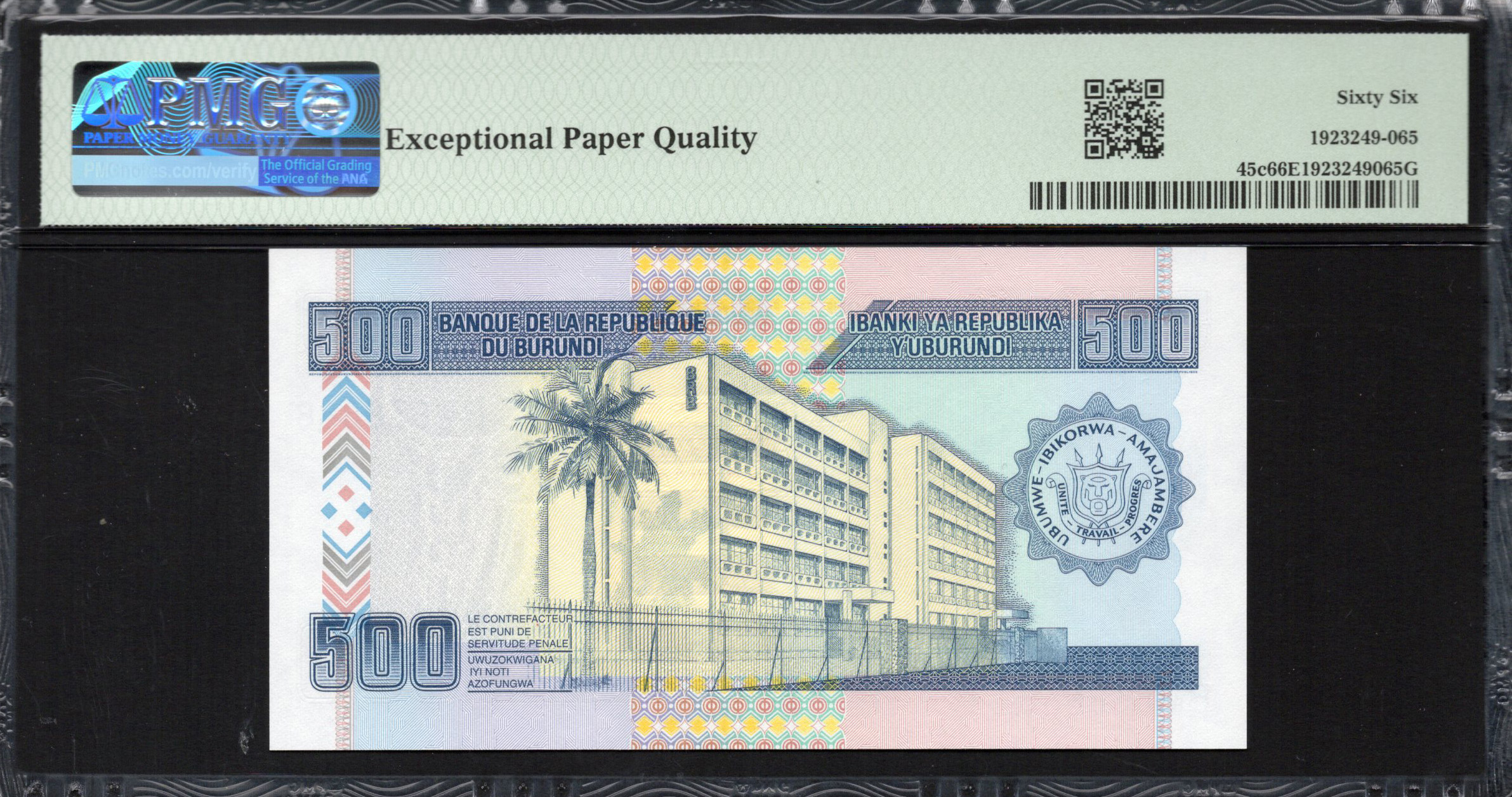 Le verso du billet poursuit le thème artistique avec des designs colorés rappelant les tissus traditionnels burundais. Il affiche en évidence la dénomination '500', accompagnée de motifs complexes symbolisant l'unité et les valeurs familiales. Ce côté est orné de couleurs vives comme le bleu et le vert, augmentant à la fois l'attrait artistique et la sécurité visuelle. Le verso présente également un numéro de série et des éléments de sécurité supplémentaires conçus pour contrer la contrefaçon, assurant ainsi la confiance dans ce moyen de paiement légal.