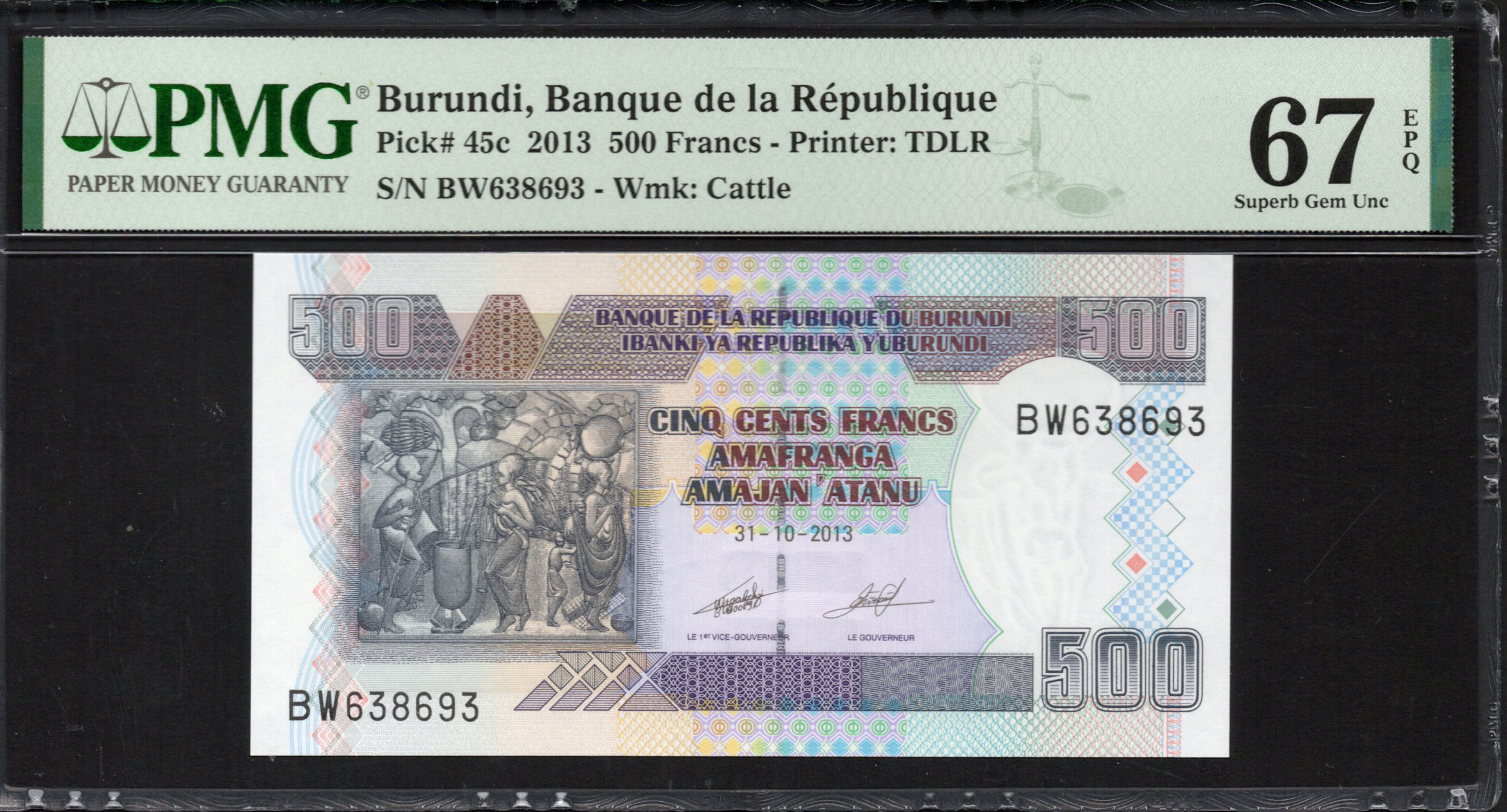 Le billet de 500 Francs du Burundi, émis en 2013, associe des éléments artistiques et de sécurité qui reflètent la culture et le contexte économique du pays. En particulier, le recto présente une impressionnante illustration en niveaux de gris de la musique et de la danse traditionnelles burundaises, mettant en valeur le riche patrimoine des arts du spectacle du pays. L'utilisation de dégradés de couleurs chaudes en arrière-plan renforce l'attrait visuel, tandis que le filigrane représentant du bétail souligne l'importance agricole au Burundi. Le verso arbore des motifs géométriques complexes et des couleurs vives, symbolisant la nature interdisciplinaire de l'artisanat burundais. Ce billet inclut également des éléments de sécurité avancés tels que des micro-impressions et des hologrammes, le rendant difficile à contrefaire.