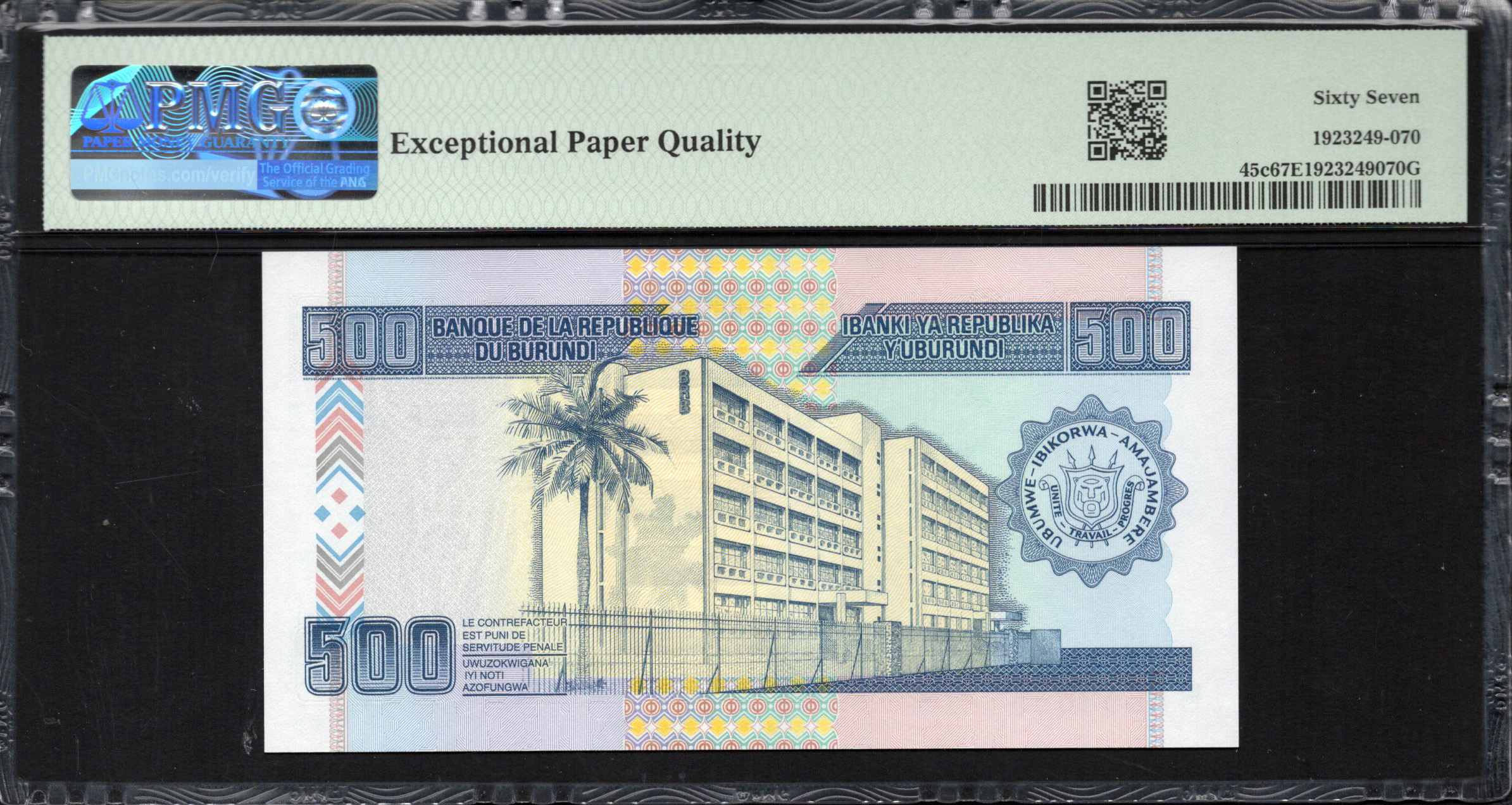 Le recto du billet de 500 Francs présente une illustration puissante en niveaux de gris qui capture l'essence des traditions burundaises, mettant en avant des musiciens et des danseurs en action. Les éléments comme les tambours et les vêtements locaux font ressortir la richesse culturelle du Burundi. De plus, les couleurs vives des motifs environnants, qui mélangent des teintes chaudes avec des accents teal et violet, ajoutent non seulement un intérêt visuel mais aident également à distinguer les véritables billets des contrefaçons. Le filigrane, visible à la lumière, représente du bétail, signifiant les fondements agricoles du pays, et il y a aussi plusieurs éléments de sécurité intégrés dans le billet, y compris des microtextes et des conceptions complexes qui compliquent sa duplication.
