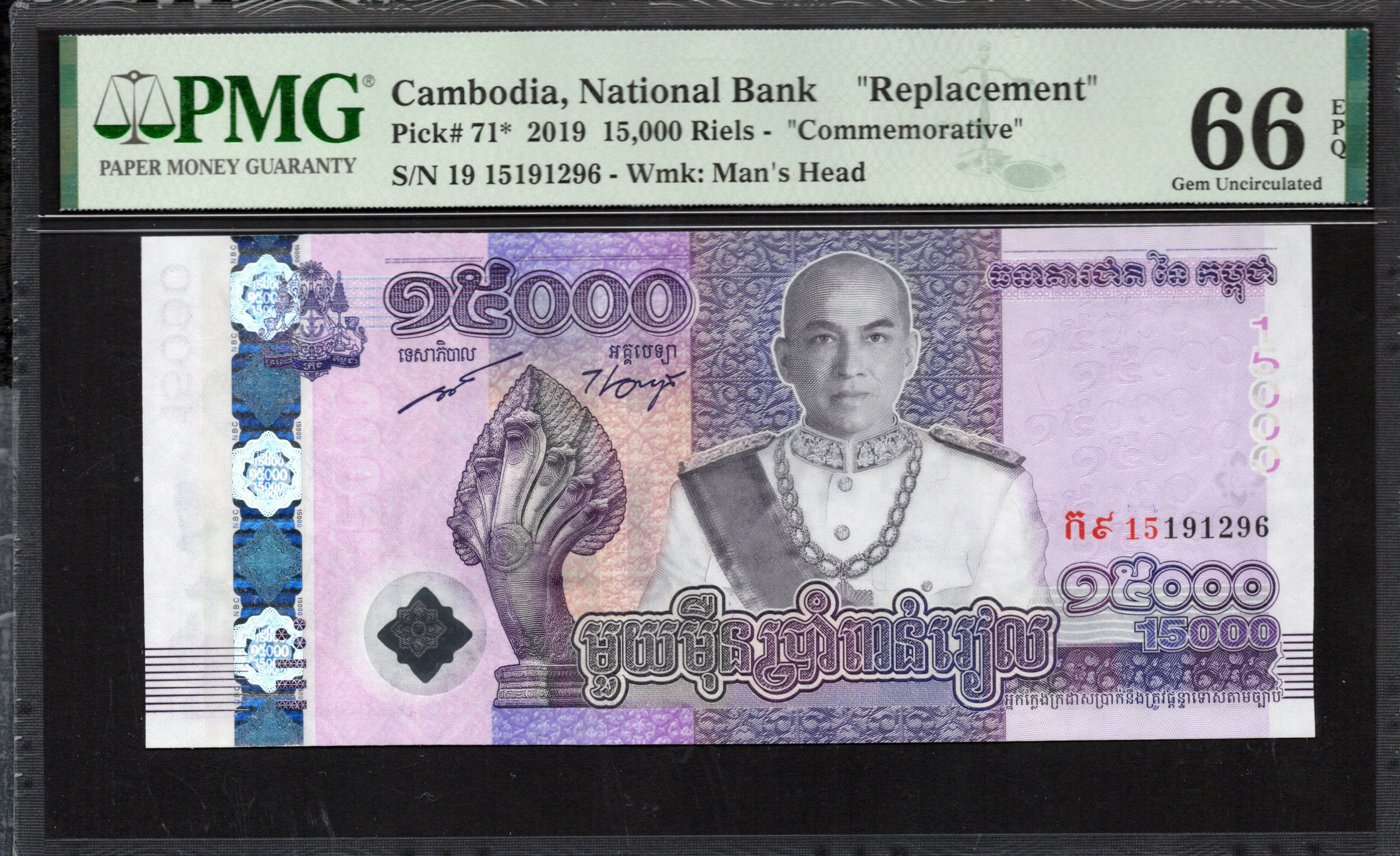 L'avant du billet de 15 000 riels affiche le portrait d'une figure historique en tenue traditionnelle, capturant l'essence de l'histoire cambodgienne. L'arrière-plan présente des motifs complexes qui évoquent des motifs culturels. Des caractéristiques de sécurité remarquables, telles qu'un filigrane et un micro-impression, garantissent une protection contre la contrefaçon. Des couleurs dominantes comme le violet et le bleu augmentent son attrait visuel, renforçant son importance en tant que monnaie. De plus, les dénominations sont clairement indiquées pour assurer une reconnaissance facile.