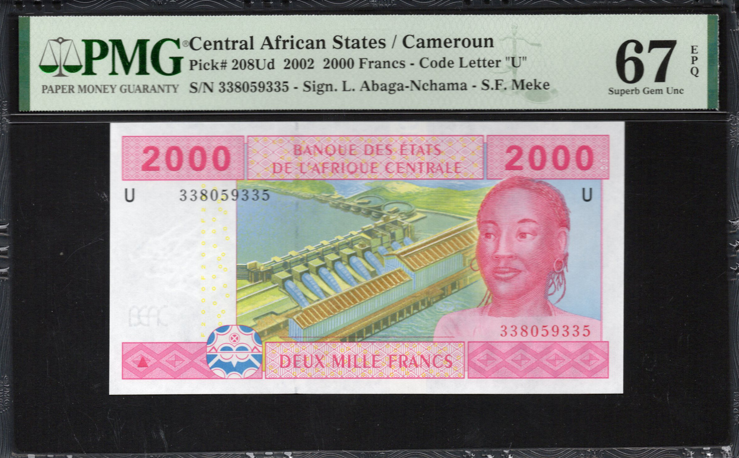 L'avant du billet de 2000 Francs arbore un portrait d'une femme, représentant l'identité culturelle de la région. En arrière-plan, une illustration d'un barrage hydroélectrique symbolise l'importance de la production d'énergie en Afrique centrale. Les couleurs dominantes sont le rose et le bleu, avec divers motifs géométriques qui ajoutent à l'attrait esthétique du billet. Des caractéristiques de sécurité telles qu'un filigrane et une micro-impression renforcent sa protection contre la contrefaçon, garantissant l'intégrité du billet.
