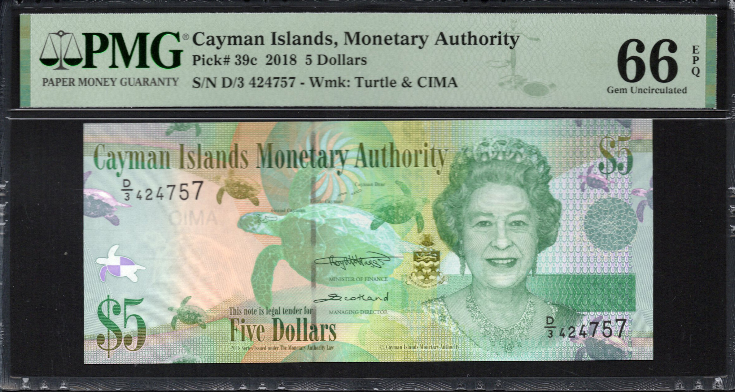 L'avant du billet de 5 $ présente en évidence un portrait de la reine Elizabeth II, rendu avec des détails complexes qui mettent en valeur ses traits. Autour d'elle, divers éléments de la beauté naturelle des îles, y compris une tortue stylisée et divers motifs aquatiques, incarnent la faune culturelle de la région. Le billet affiche une palette de bleus et de verts, créant un dégradé attrayant qui évoque la mer. Les caractéristiques de sécurité visibles comprennent une fenêtre transparente pour la vérification et le filigrane qui correspond à l'image de la reine, ainsi que du microtexte qui renforce son authenticité.