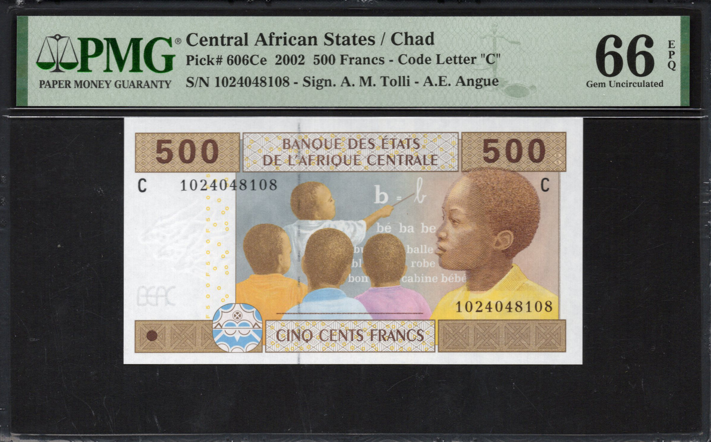 Le billet de 500 Francs du Tchad, daté de 2002, présente des illustrations vibrantes et symbolise la riche culture de la région centrale d'Afrique. Le recto met en avant des images d'enfants engagés dans des activités éducatives, soulignant l'importance de l'apprentissage dans la société. Le billet est décoré de motifs délicats et de caractéristiques de sécurité, notamment un filigrane et de la microécriture, garantissant son authenticité. Le verso présente des thèmes éducatifs supplémentaires et des éléments culturels, faisant de ce billet non seulement une monnaie, mais aussi une représentation du patrimoine tchadien.