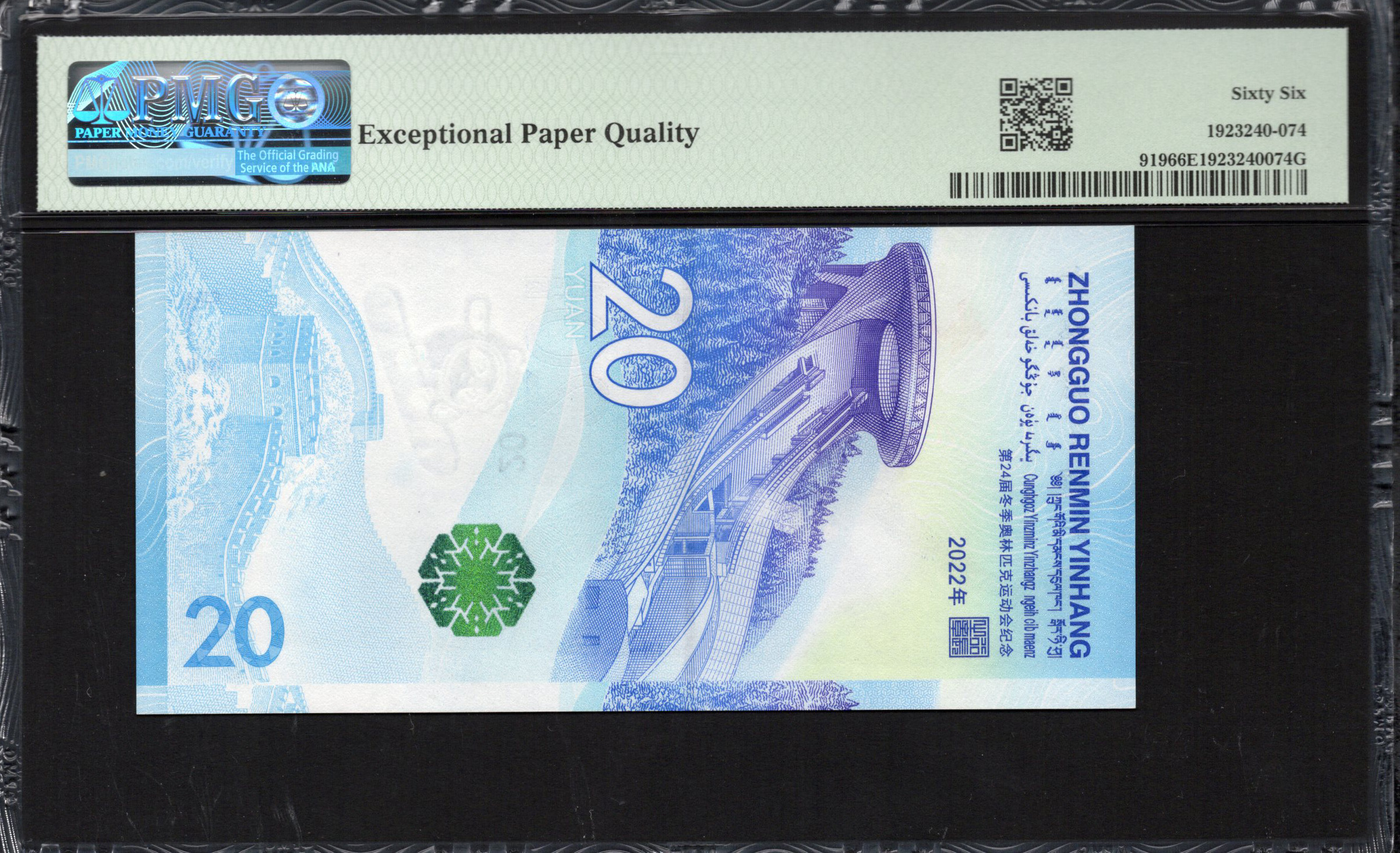 Le revers de ce billet poursuit le thème olympique, avec des paysages enneigés et le chiffre "20" affiché en évidence. Il comprend également des motifs complexes qui reflètent la culture chinoise, ainsi que des images typiques des sports d'hiver. Le design utilise des couleurs vives qui contrastent fortement avec la teinte bleue au recto, augmentant ainsi son attrait. Des caractéristiques de sécurité telles que des micro-impressions et des éléments holographiques ajoutent de la sophistication, garantissant l'intégrité du billet tout en célébrant l'excitation des Jeux Olympiques.