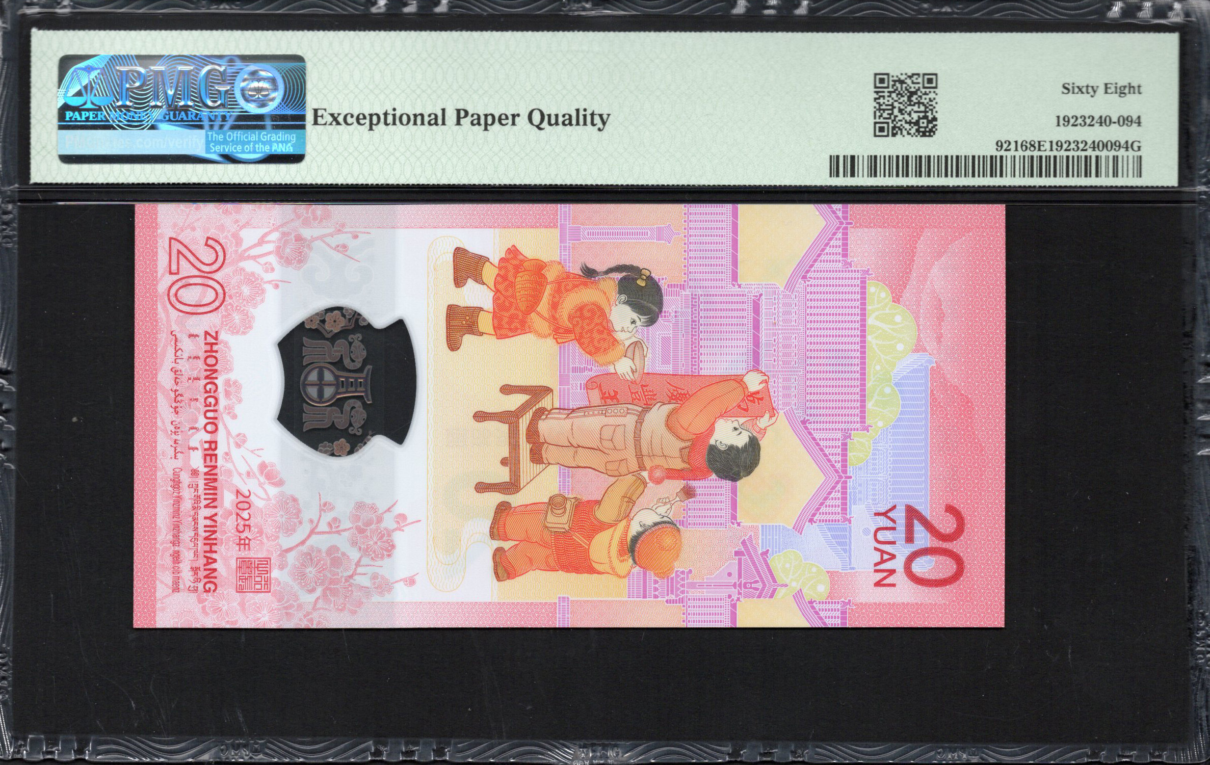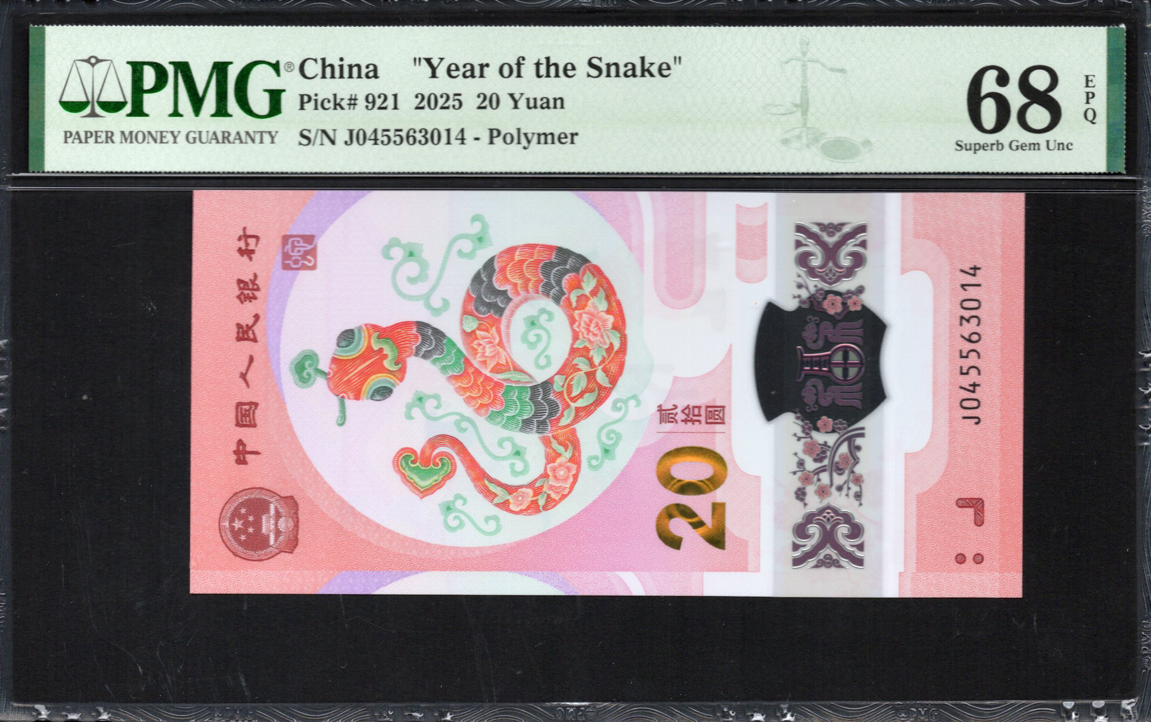 Le billet de 20 Yuan de Chine, émis pour l'Année du Serpent en 2025, présente des œuvres d'art complexes et des caractéristiques de sécurité remarquables. Le design vibrant montre un serpent magnifiquement détaillé entrelacé avec des motifs floraux, symbolisant la chance et la prospérité. Ce billet en polymère combine l'art traditionnel avec une technologie moderne, offrant une esthétique visuelle et une sécurité. Il comprend des éléments holographiques, un filigrane et de la micro-écriture pour prévenir la contrefaçon. L'utilisation de couleurs vives comme le rouge, le vert et le bleu rehausse l'esthétique tout en reflétant une signification culturelle.