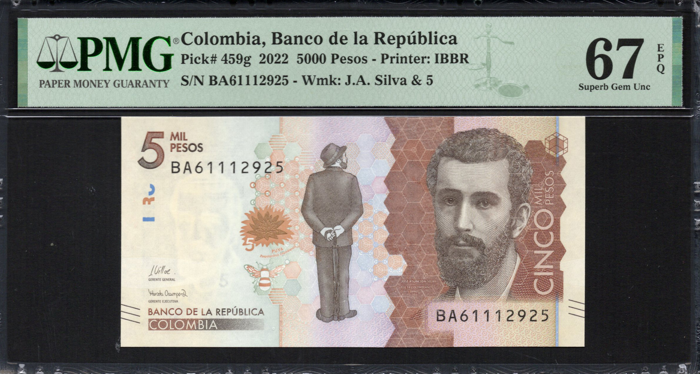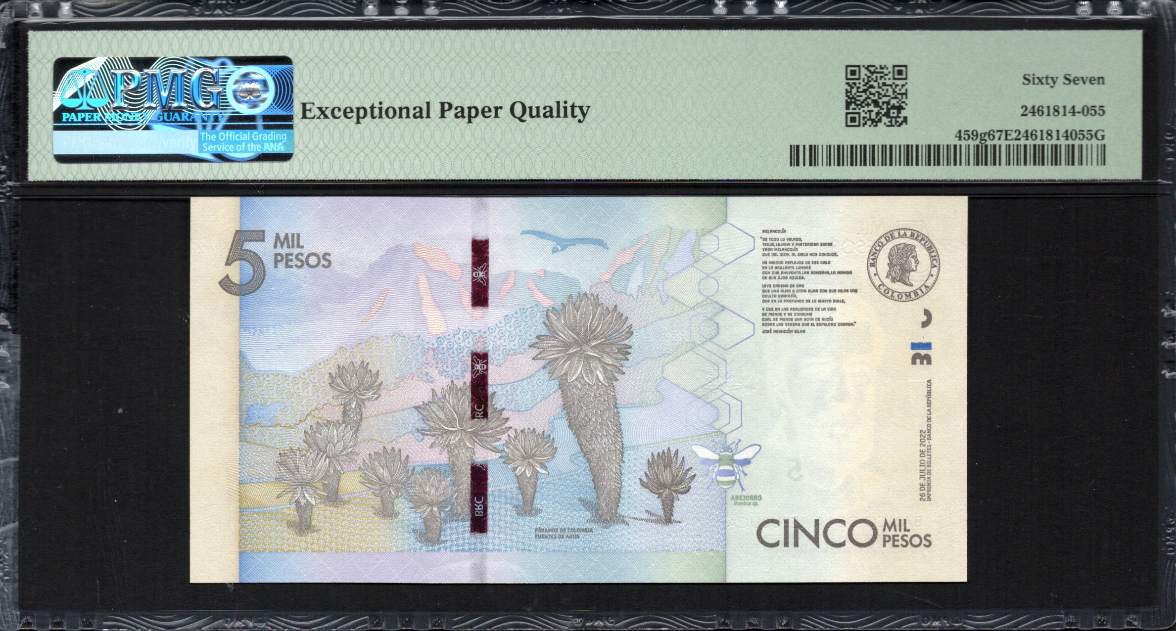 Le billet de 5000 Pesos colombien présente des designs complexes qui allient éléments culturels et caractéristiques de sécurité modernes. Ce billet représente un morceau significatif de la monnaie colombienne, mettant en avant à la fois la beauté artistique et des mesures avancées de lutte contre la contrefaçon. Sur le recto, on peut observer des images détaillées de figures importantes et des couleurs vives, tandis que le verso met en avant des designs artistiques supplémentaires qui reflètent le patrimoine colombien. Ce billet fait partie de l'engagement continu de la Banque de la République envers une monnaie sécurisée et esthétiquement plaisante.