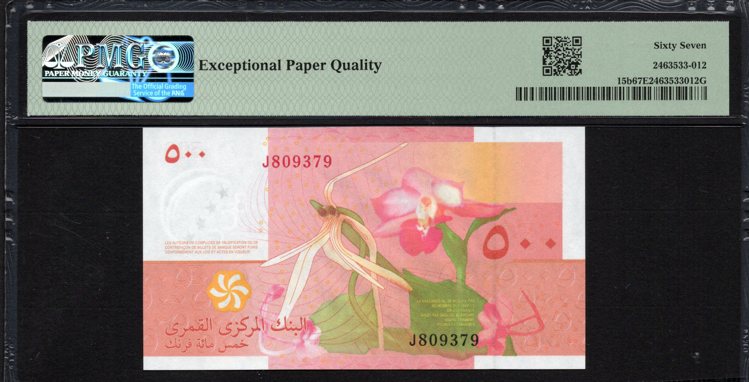Le revers de ce billet de 500 francs présente un agencement harmonieux de motifs abstraits et de symboles locaux, contribuant à une expérience esthétique riche. Les couleurs se mêlent de manière fluide, cherchant à capturer l'essence du paysage naturel environnant. De plus, un emblème vert intégrant des formes circulaires fait référence au patrimoine de l'île. Comme sur la face avant, des éléments de sécurité sont présents, tels qu'un élément holographique subtil, qui aide à garantir l'authenticité et ajoute de la profondeur à la présentation visuelle. Dans l'ensemble, le revers complète l'avant avec ses détails complexes et sa symbolique pertinente.