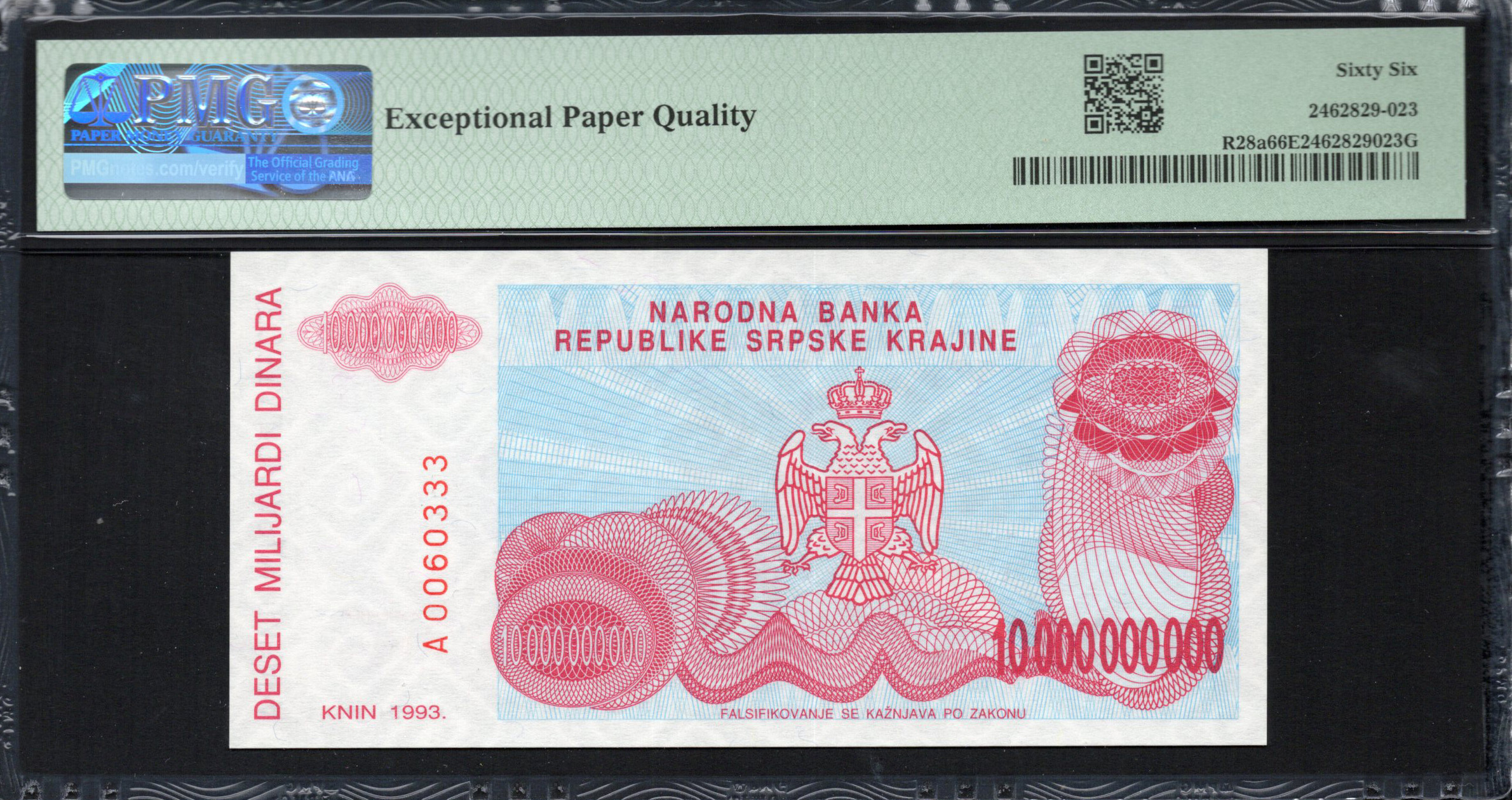 Ce billet de 10 milliards de dinars est un exemple remarquable de la monnaie croate de 1993. Arborant des designs complexes, le billet incarne des éléments culturels et historiques importants. L'avers présente une vive combinaison de couleurs, notamment des rouges et des bleus, ainsi que des motifs ornés qui améliorent son attrait esthétique. Le filigrane et les micro-impressions fournissent des caractéristiques de sécurité essentielles pour prévenir la contrefaçon. Le revers révèle une illustration détaillée d'une forteresse historique, représentant le riche patrimoine de la région. Le contraste entre les couleurs vives et les traits fins fait de ce billet non seulement un moyen d'échange mais aussi une œuvre d'art qui reflète l'identité de la Croatie.
