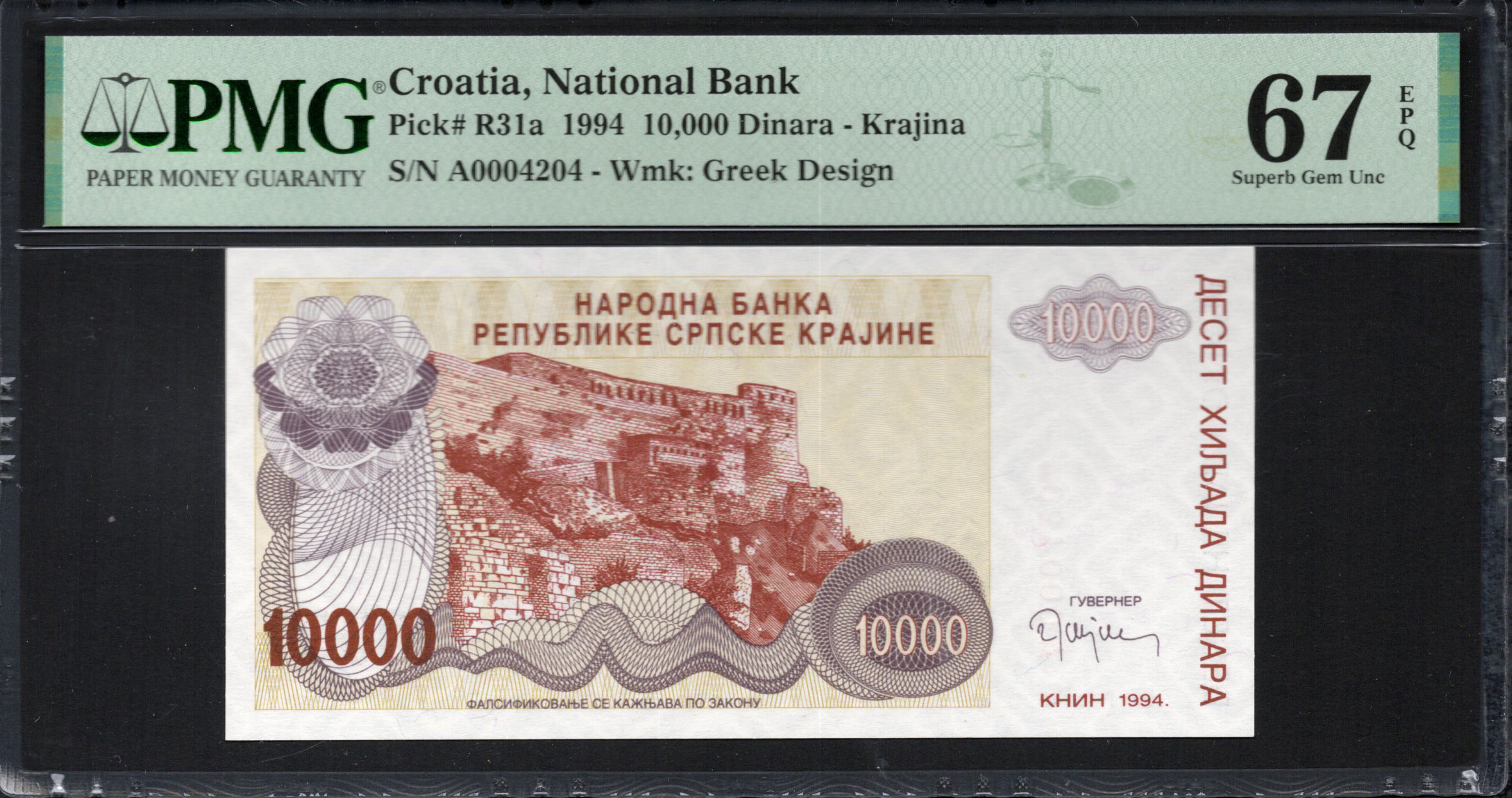 Le recto du billet affiche en évidence le montant '10 000' en grandes lettres, entouré d'un motif floral décoratif ajoutant une touche artistique complexe. Au-dessus, le texte en cyrillique indique 'Narodna banka Republike Srpske Krajine', désignant l'autorité émettrice. L'arrière-plan présente un château historique, illustrant la culture et le patrimoine locaux, rendu dans des tons chauds qui créent un contraste visuel attrayant. Les caractéristiques de sécurité incluent un filigrane translucide et des motifs microscopiques difficiles à reproduire.