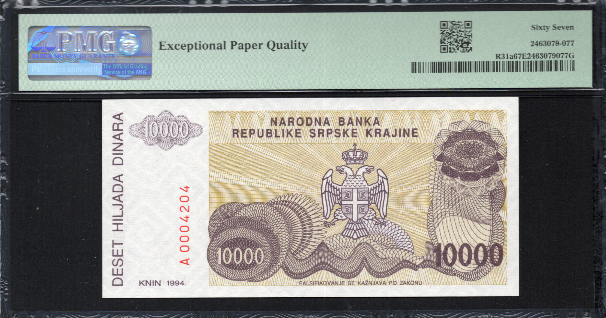 Ce billet de banque de la Banque nationale de Croatie présente une valeur de 10 000 dinars, émis en 1994. Le design associe des motifs historiques et floraux, reflétant le patrimoine de la région. L'utilisation marquée de dégradés de couleurs rehausse son attrait esthétique tout en intégrant diverses caractéristiques de sécurité essentielles pour éviter la contrefaçon.