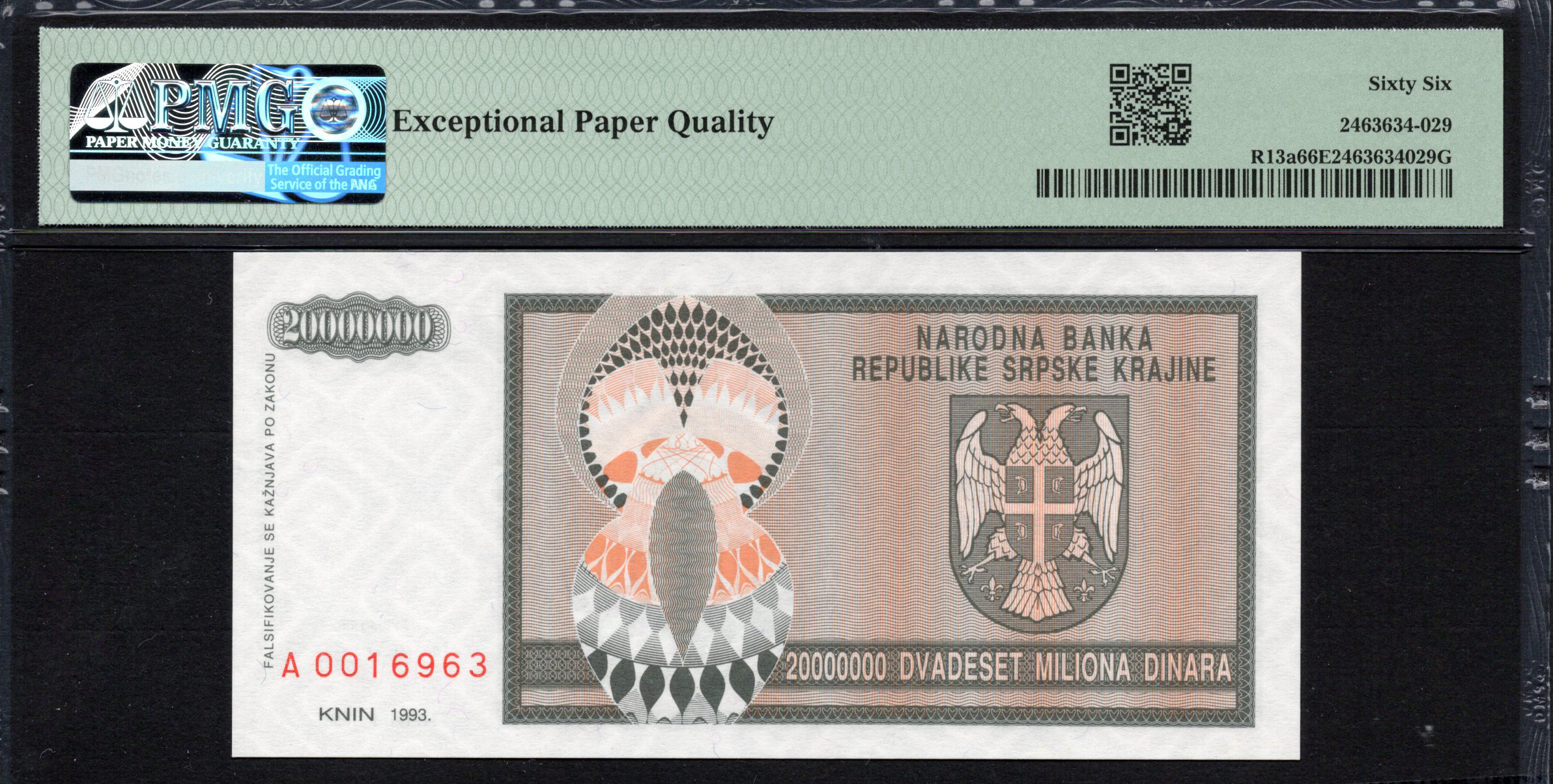 Le recto affiche un design détaillé intégrant l'emblème national de la République serbe de Krajina, présentant en avant un aigle à deux têtes entouré d'une bordure vibrante. La palette de couleurs comprend des nuances d'orange et de brun, complétées par des verts, créant un effet visuel frappant. Les caractéristiques de sécurité comme les filigranes et la micro-impression sont probablement présentes, typiques des billets de banque pour prévenir la contrefaçon.