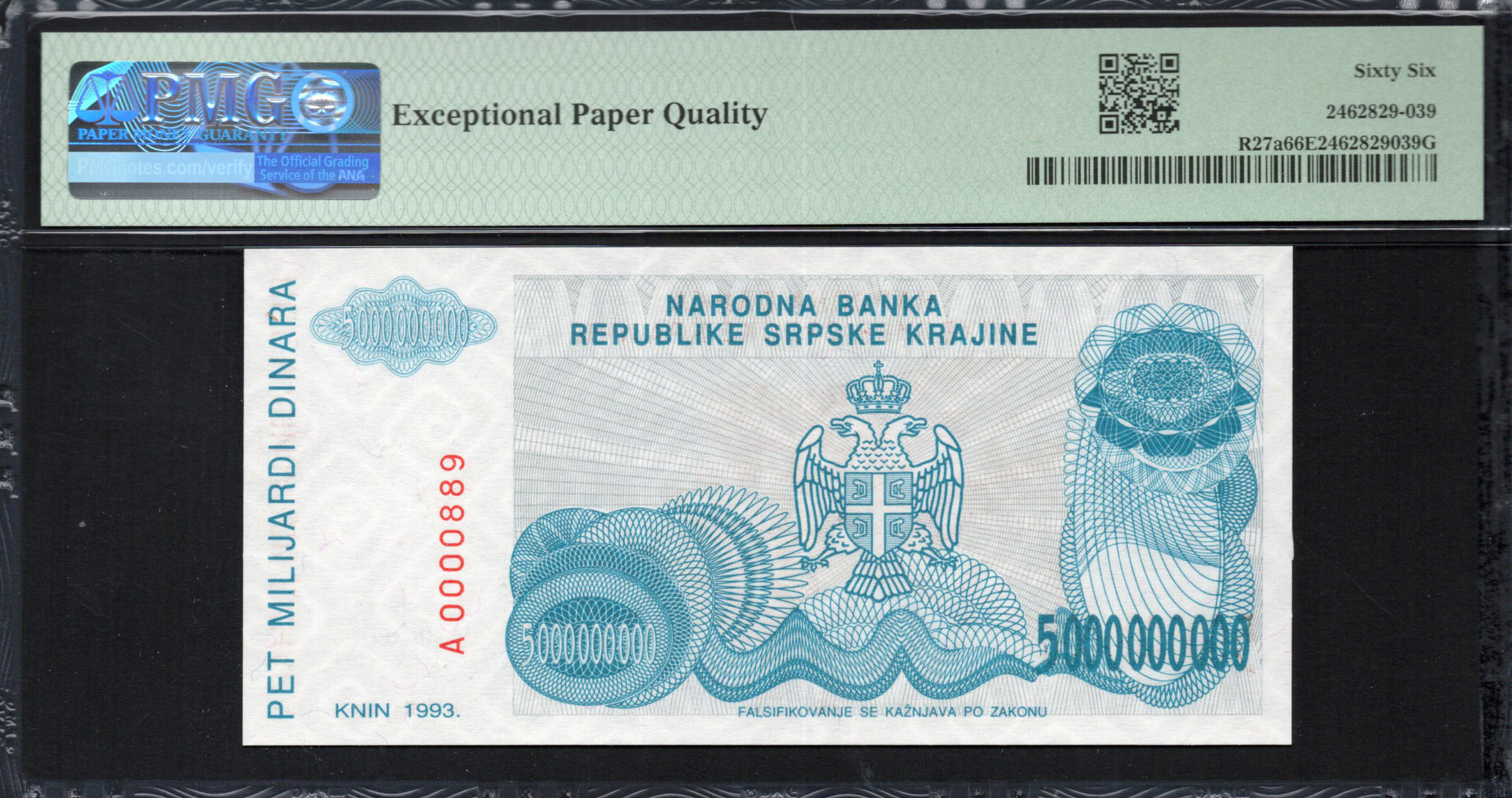 Le revers présente un jeu dynamique de motifs géométriques et de couleurs, principalement dans des teintes de bleu. Ce côté met en avant la dénomination '5.000.000.000' répétée pour renforcer son impact, ainsi que des textes supplémentaires en écriture serbe. Les conceptions compliquées suggèrent une richesse culturelle et un héritage, tandis que des éléments cachés comme des filigranes servent de caractéristiques de sécurité. Cette combinaison d'éléments visuels sert non seulement des fins fonctionnelles, mais reflète également l'esprit artistique de l'époque, encapsulant à la fois un moment de beauté et de signification historique dans le design de la monnaie croate.
