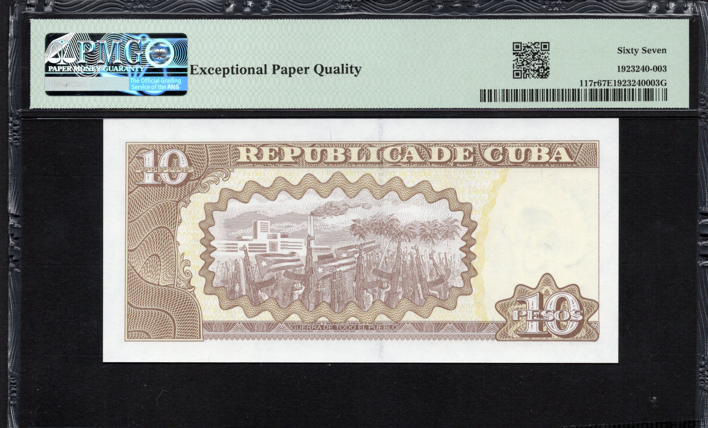 Le verso du billet continue le thème de la représentation culturelle, avec des éléments décoratifs supplémentaires et un design qui souligne l'importance nationale de la banque. Il présente des motifs symbolisant le riche héritage de Cuba, avec la dénomination répétée sous plusieurs formats. Les couleurs de ce côté sont également plutôt atténuées, avec un mélange de bruns et de fonds qui maintiennent l'accent sur les motifs centraux. Les caractéristiques de sécurité sont également présentes sur ce côté, ajoutant des couches de protection tout en contribuant à l'impression artistique globale du billet.