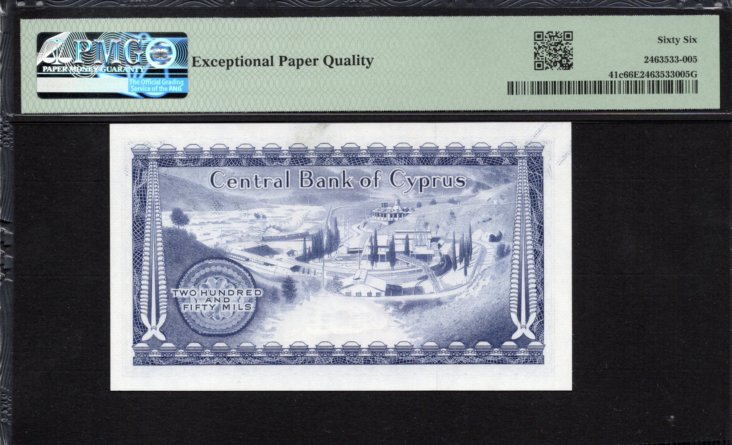 Le recto du billet de 250 Mils se distingue par une palette de couleurs chaudes, mêlant des teintes orange et bleues. Le point central est une représentation stylisée d'une tête d'aigle, symbole significatif reflétant l'héritage de Chypre. Une bordure ornementale encadre également le design central, augmentant son attrait esthétique. Diverses caractéristiques de sécurité, telles qu'un fond filigrané et des micro impressions, ajoutent à l'authenticité du billet. La dénomination '250 Mils' est affichée de manière proéminente, la rendant facile à identifier au premier coup d'œil.