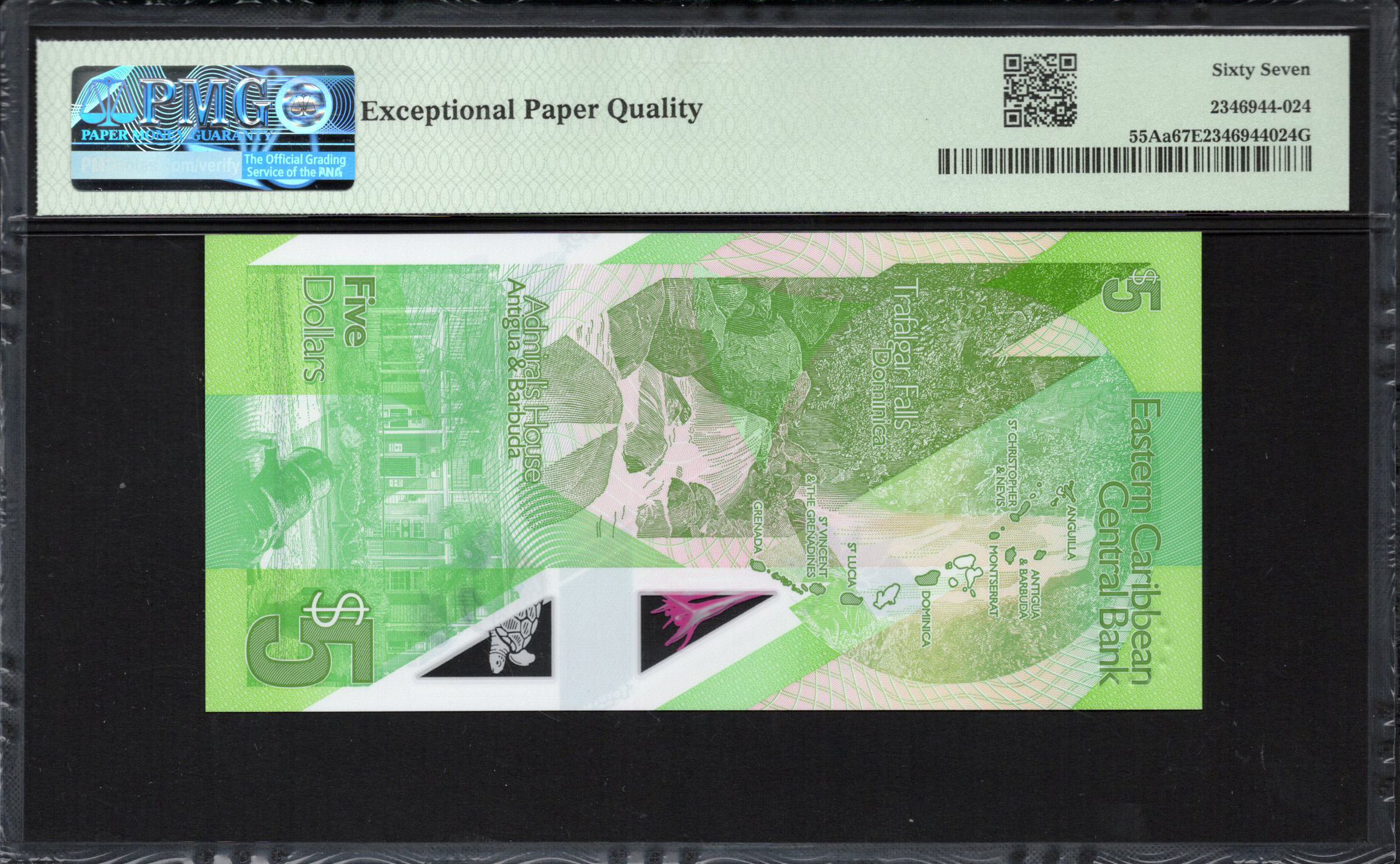 Le billet de 5 dollars de la Banque Centrale des Caraïbes orientales présente un design vibrant et complexe, mettant en valeur le patrimoine culturel et la beauté naturelle de la région. Sa face avant est dominée par un portrait de la reine Elizabeth II, complété par des éléments colorés tels que des fleurs tropicales et la faune. L'utilisation de matériaux en polymère renforce sa durabilité et ses caractéristiques de sécurité, faisant de lui un élément essentiel de la monnaie régionale.