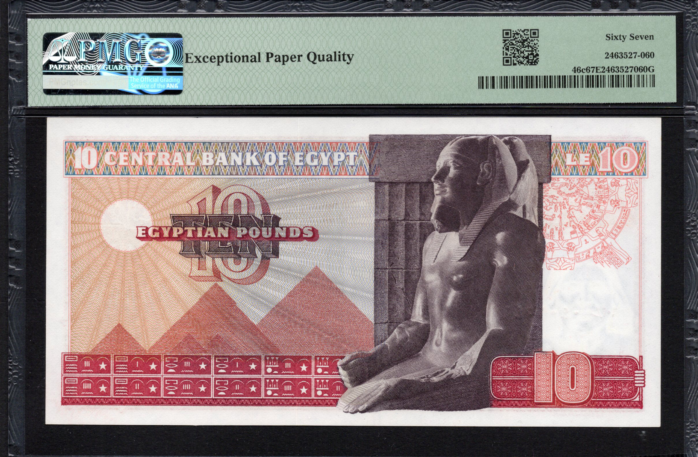 L'avant du billet de banque présente une mosquée proéminente, illustrant l'architecture islamique en Égypte. Autour de la mosquée se trouvent des motifs complexes et des couleurs vives, principalement des nuances de rouge et de vert, qui sont courantes dans l'esthétique égyptienne. Le billet intègre divers éléments de sécurité, tels qu'un filigrane et un microtexte, renforçant ainsi son authenticité. Les chiffres en gras et la calligraphie arabe fournissent un contexte culturel supplémentaire et indiquent la valeur du billet.