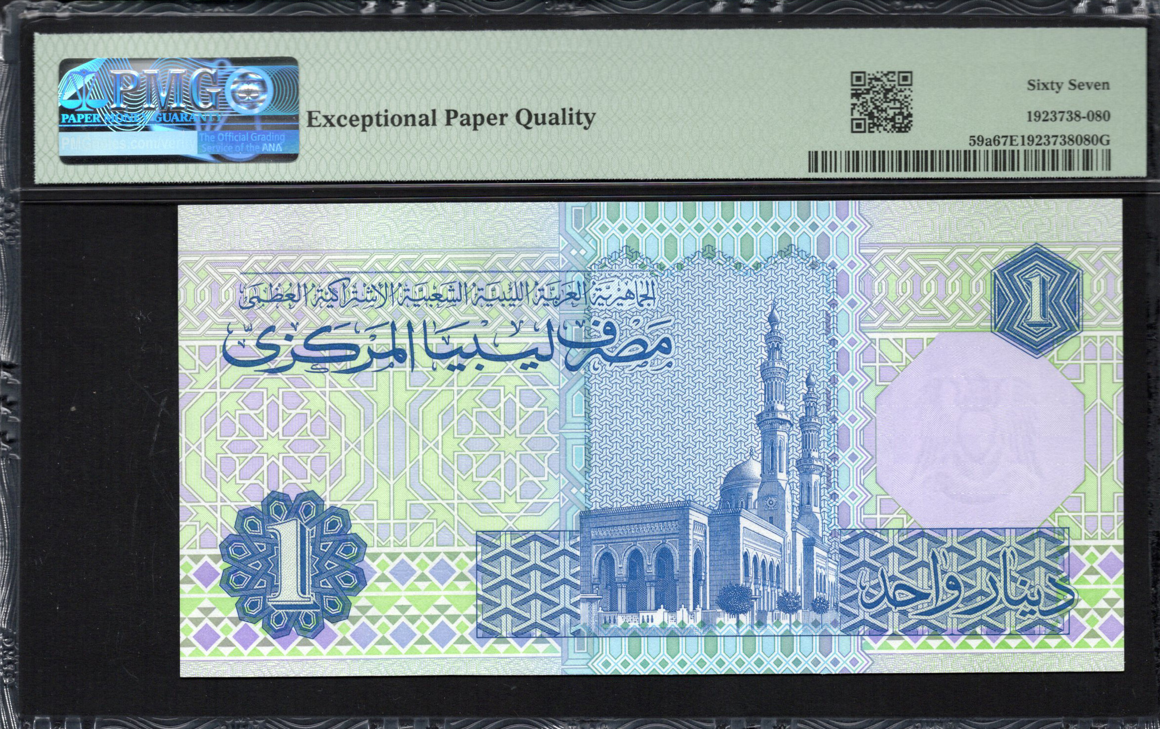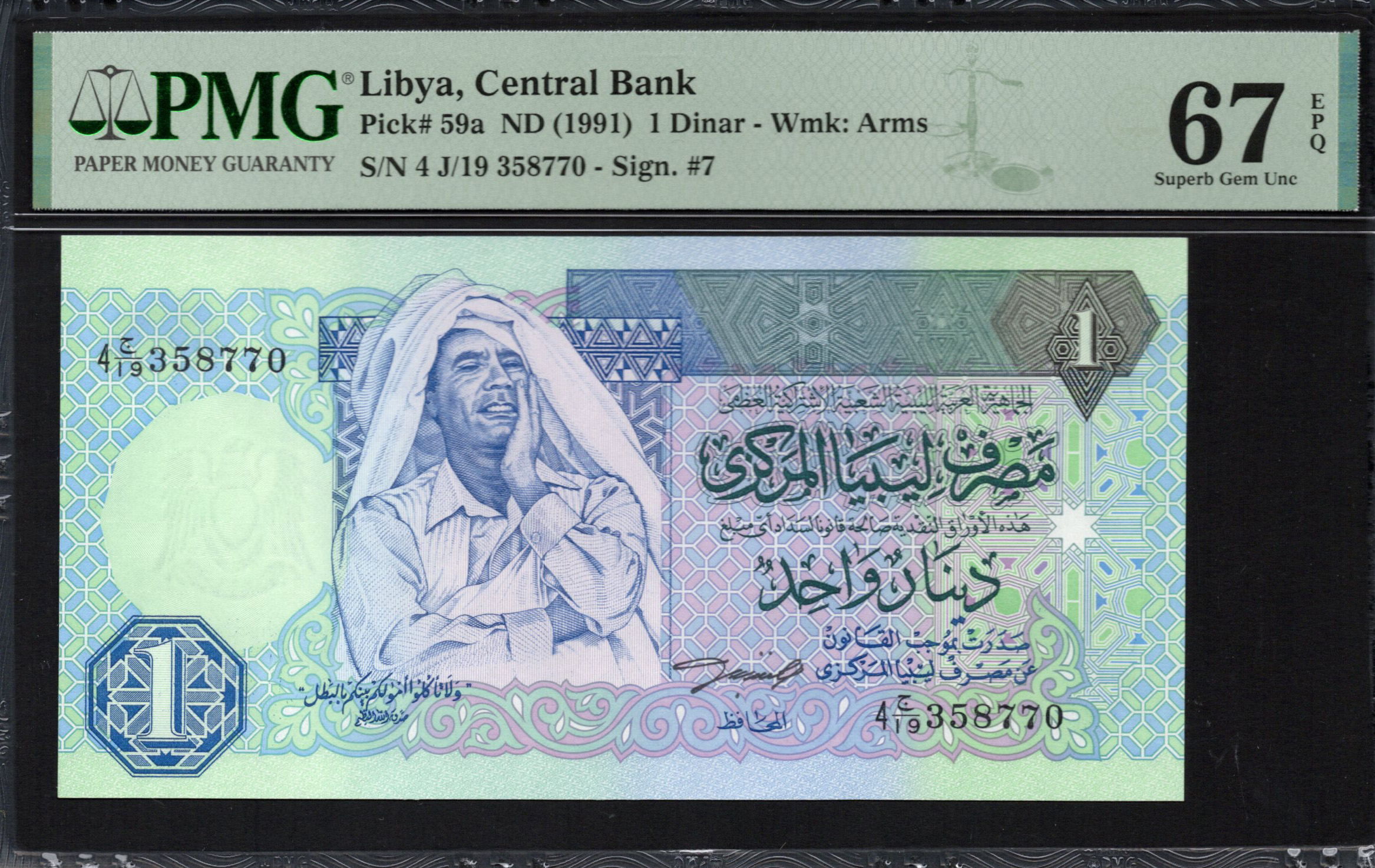 Le billet de 1 Dinar libyen, émis par la Banque centrale, présente des éléments artistiques complexes, des couleurs vives et des caractéristiques de sécurité uniques. Le billet est principalement décoré de teintes de vert et de bleu avec une représentation saisissante d'un homme souriant vêtu d'une tenue traditionnelle, mettant en avant la richesse culturelle de la Libye. L'arrière-plan comporte des motifs géométriques qui ajoutent de la vitalité et de la profondeur. Chaque composant est soigneusement conçu pour symboliser l'identité nationale et le patrimoine. Les caractéristiques de sécurité comprennent un filigrane et un numéro de série, ce qui en fait un spécimen précieux pour les collectionneurs.