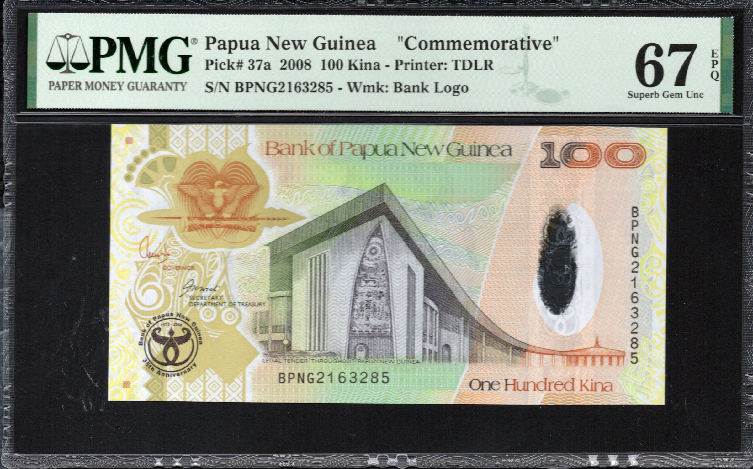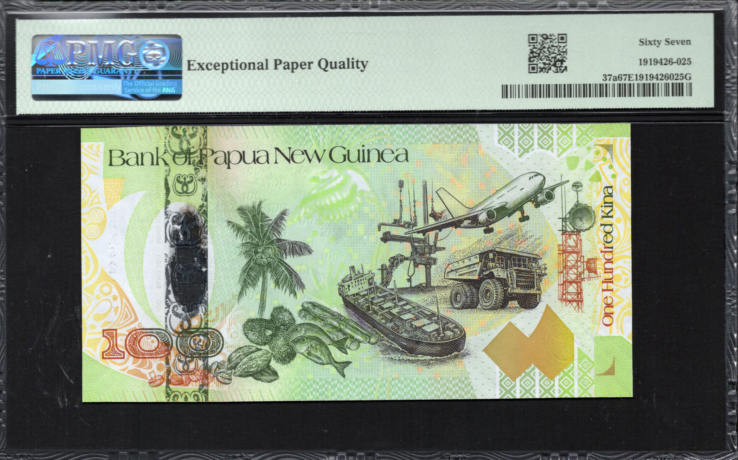La face avant du billet de 100 Kina est marquée par un design frappant qui incorpore plusieurs caractéristiques notables. Elle présente une palette de couleurs éclatantes, principalement des verts et des jaunes, avec un accent sur l'oiseau de paradis emblématique, symbole national de la Papouasie-Nouvelle-Guinée. La dénomination '100' est en gras et bien visible, complétée par des motifs ornés qui signifient le patrimoine culturel. De plus, des éléments de sécurité tels qu'un filigrane et une microécriture peuvent être observés, ajoutant à son authenticité et à sa valeur artistique.
