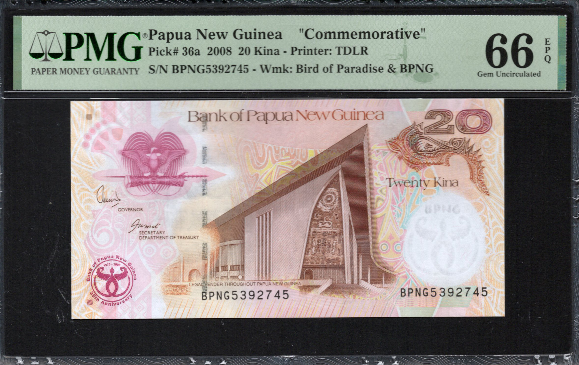 Le recto du billet de 20 Kina met en avant l'emblème de la Banque de Papouasie-Nouvelle-Guinée sur un fond représentant des motifs traditionnels. L'utilisation de teintes roses et beiges douces confère au billet une apparence élégante. Une illustration d'une structure contemporaine représente le développement, en harmonie avec des motifs traditionnels. De plus, il y a des caractéristiques de sécurité telles que l'impression micro et un filigrane d'un oiseau, améliorant l'authenticité du billet tout en ajoutant à son attrait esthétique. Le design est un mélange de modernité et d'art culturel.