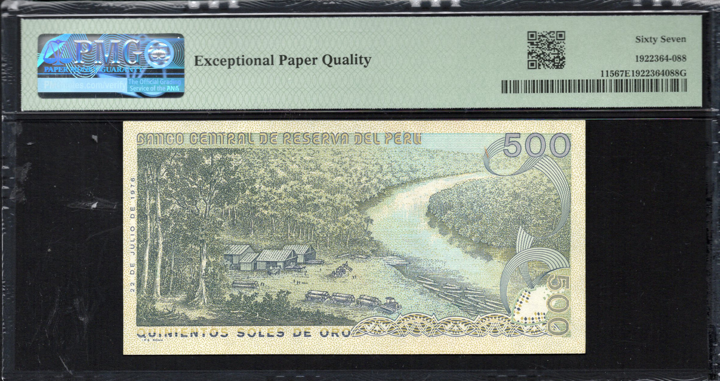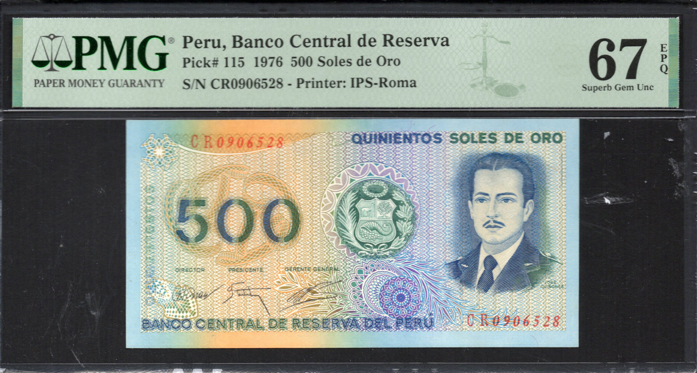 Le verso du billet présente l'emblème national du Pérou, central dans un design sophistiqué qui inclut des motifs floraux et géométriques, transmettant un sentiment de fierté nationale. La dénomination est répétée, avec 'Quinientos Soles de Oro' écrit en gras. La palette de couleurs reste uniforme, utilisant des teintes qui complètent l'avant du billet. Ce côté capture à la fois une signification culturelle et une beauté esthétique à travers des détails raffinés. Divers éléments de sécurité, tels que les encres changeantes et des éléments holographiques, sont subtilement intégrés, renforçant le profil de sécurité tout en contribuant à la complexité globale du billet.