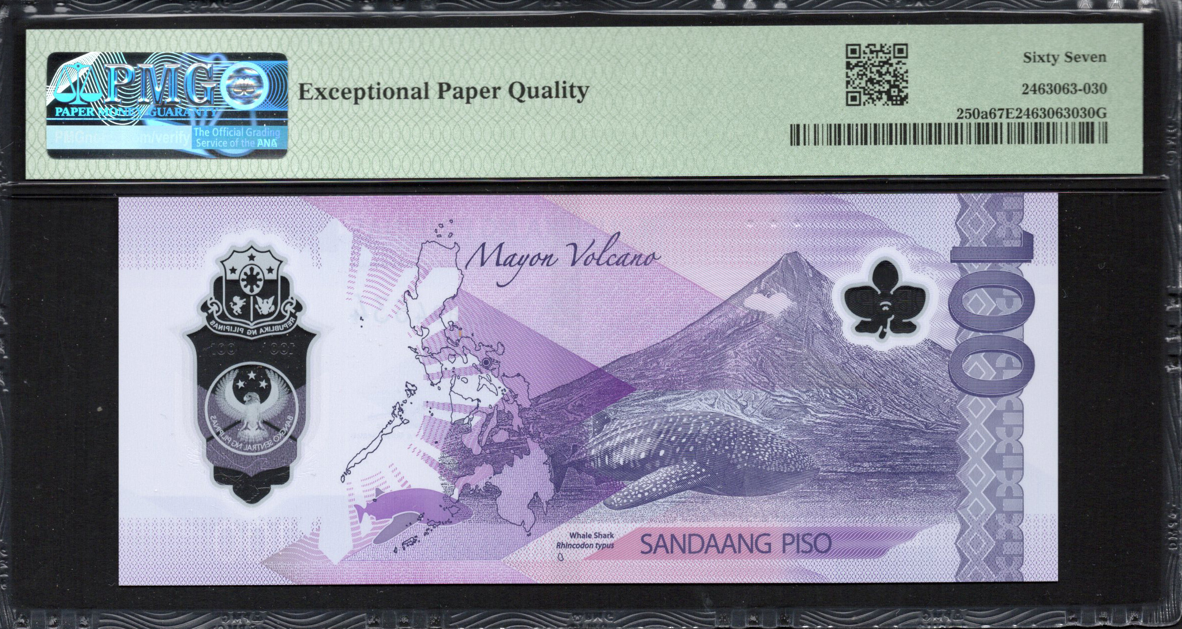 Au verso du billet de 100 Piso, nous pouvons voir un emblème stylisé représentant le sceau de la Bangko Sentral ng Pilipinas, placé sur un dégradé subtil qui passe du violet à des teintes plus claires. La dénomination '100' est affichée de manière évidente en bas, assurant une bonne visibilité. Ce côté présente également des motifs complexes qui offrent à la fois un attrait esthétique et des mesures de sécurité, comme des éléments holographiques conçus pour décourager la contrefaçon. La composition générale équilibre des éléments artistiques avec des fonctionnalités nécessaires, en faisant à la fois un moyen de paiement fonctionnel et un aperçu de la représentation culturelle.