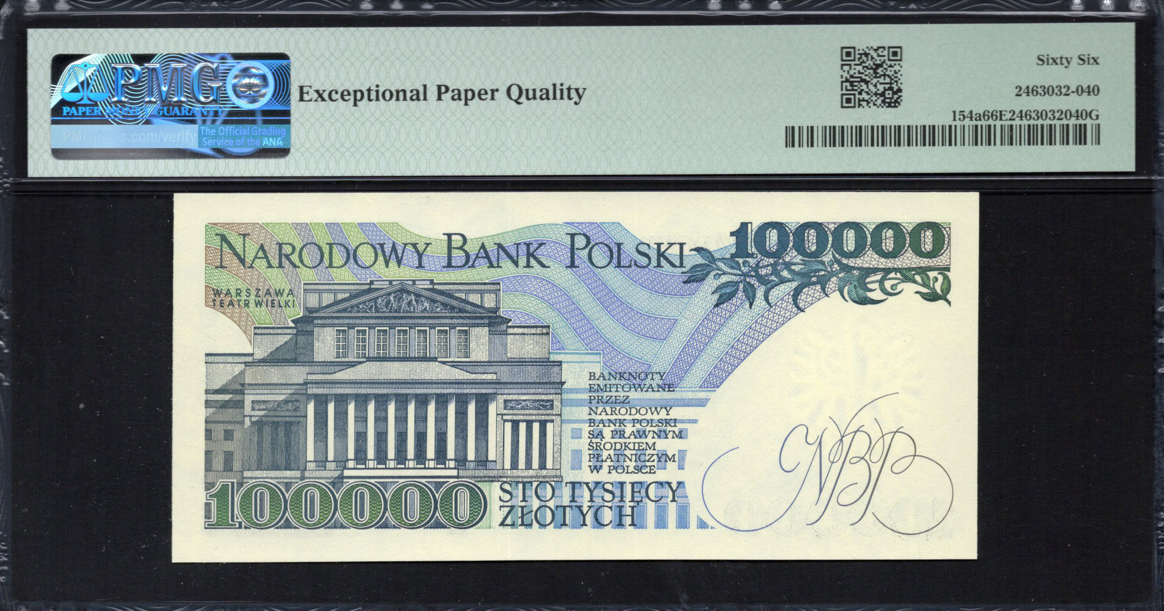 Au verso, le billet de 100 000 Zlotys révèle une représentation impressionnante de l'emblème national de la Pologne, entouré de motifs floraux délicats. L'arrière-plan présente des nuances de bleu et de vert, en harmonie avec l'avant. Ce côté ne comporte pas de portrait marqué, mais met plutôt en avant des motifs et des symboles qui reflètent la culture polonaise. Des caractéristiques de sécurité telles qu'une bande holographique et du microtexte sont intégrées au design pour garantir la protection contre la contrefaçon. L'alliance de l'esthétique artistique et des éléments de sécurité souligne l'importance du billet dans l'histoire monétaire de la Pologne.