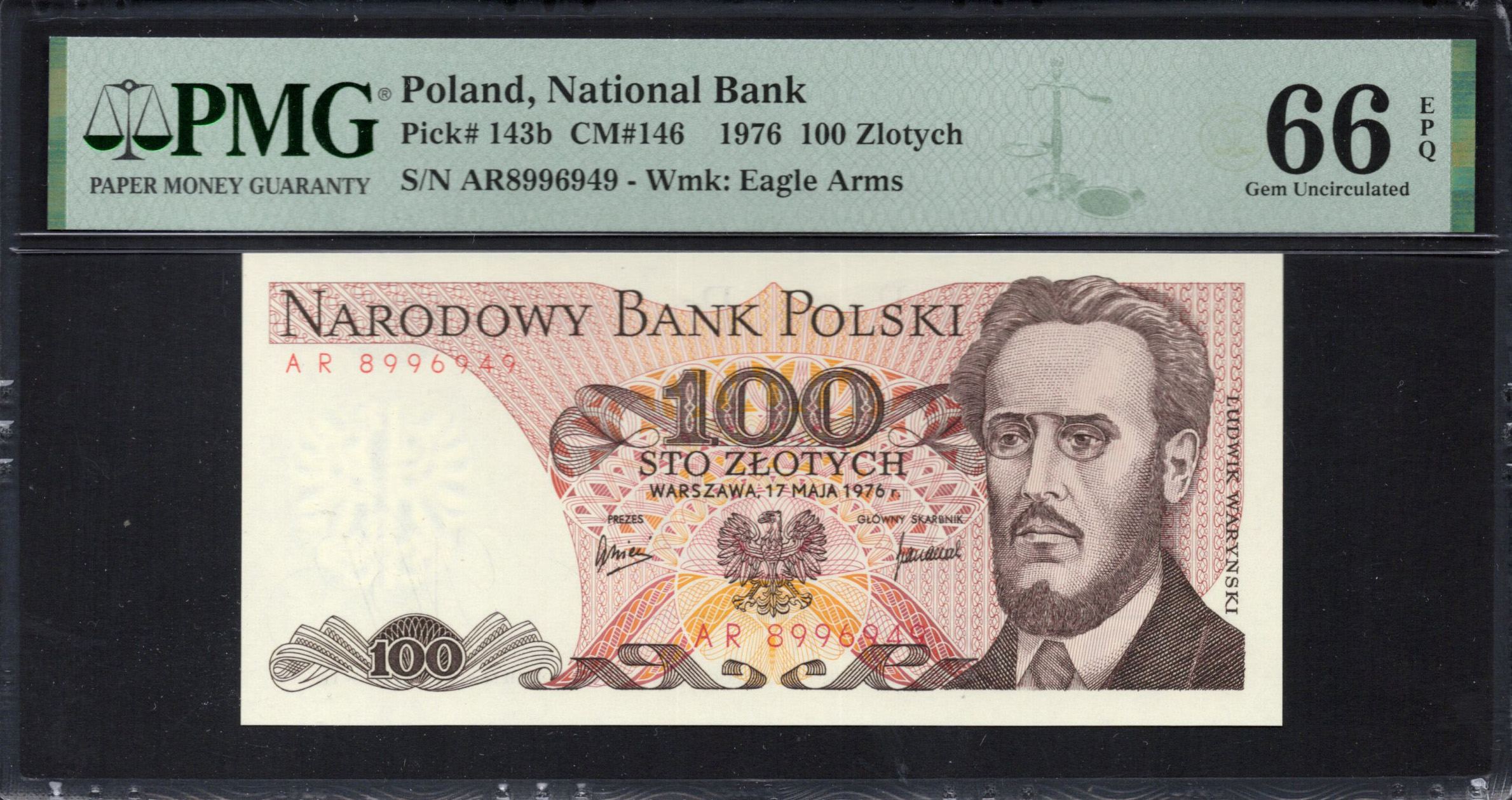 Au dos du billet, le design présente encore plus d'ornements complexes dominés par des couleurs vibrantes, illustrant une représentation de l'aigle polonais. Ce symbole emblématique souligne l'identité nationale et la souveraineté de la Pologne. La date d'émission, 'WARSZAWA 17-MAJA 1976', est élégamment écrite, marquant sa signification historique. Des mesures de sécurité telles que l'impression micro et des éléments holographiques rehaussent le design global, reflétant l'engagement envers la qualité et la protection contre la contrefaçon, tout en contribuant à la complexité esthétique du billet.