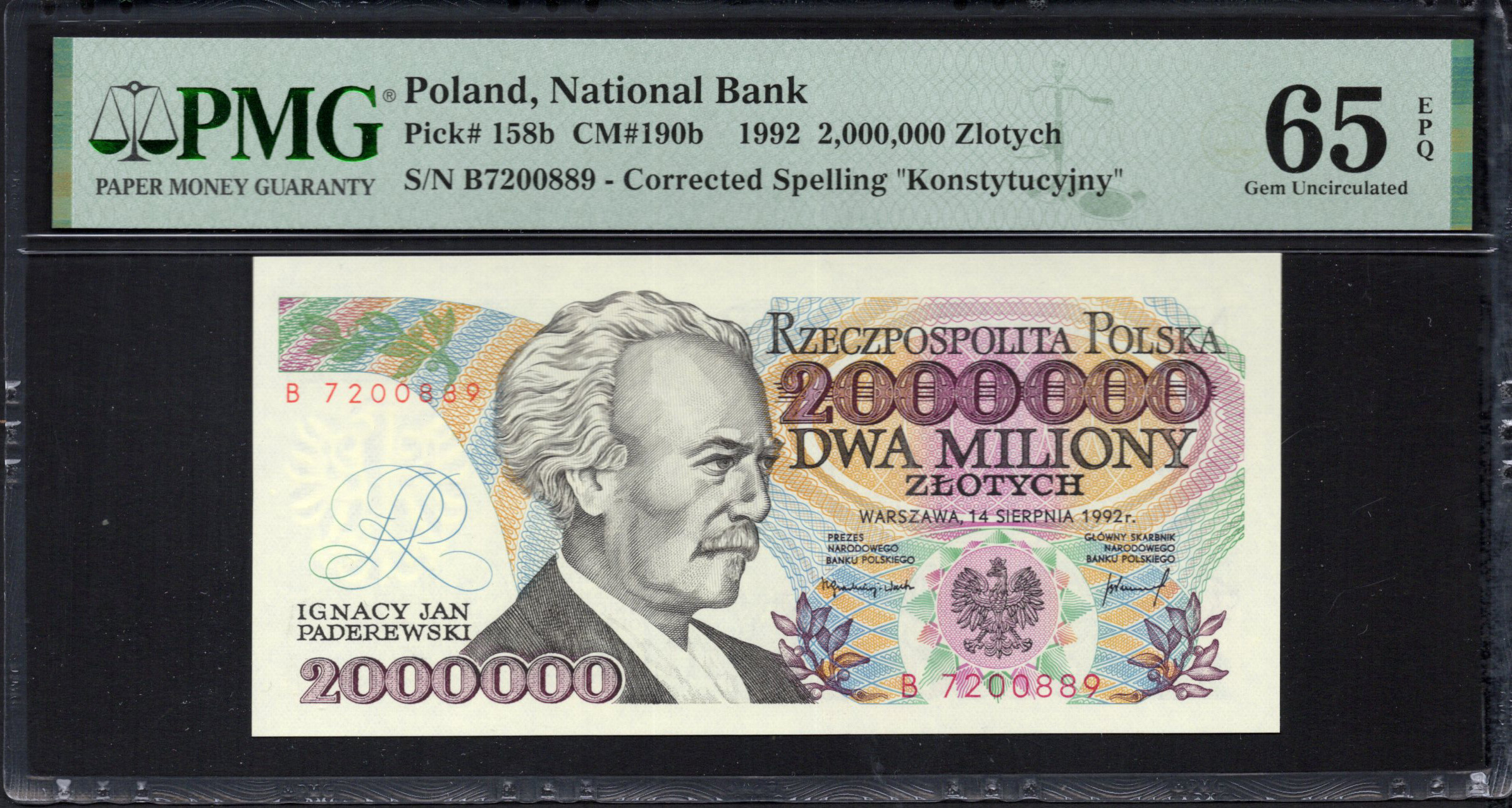 Ce billet polonais, émis par la Banque nationale de Pologne en 1992, présente des designs complexes qui illustrent le patrimoine culturel et l'évolution monétaire de la Pologne. Le billet, d'une valeur de 2.000.000 złotych, est un excellent exemple tant des éléments artistiques que des caractéristiques de sécurité souvent trouvés dans les billets modernes.