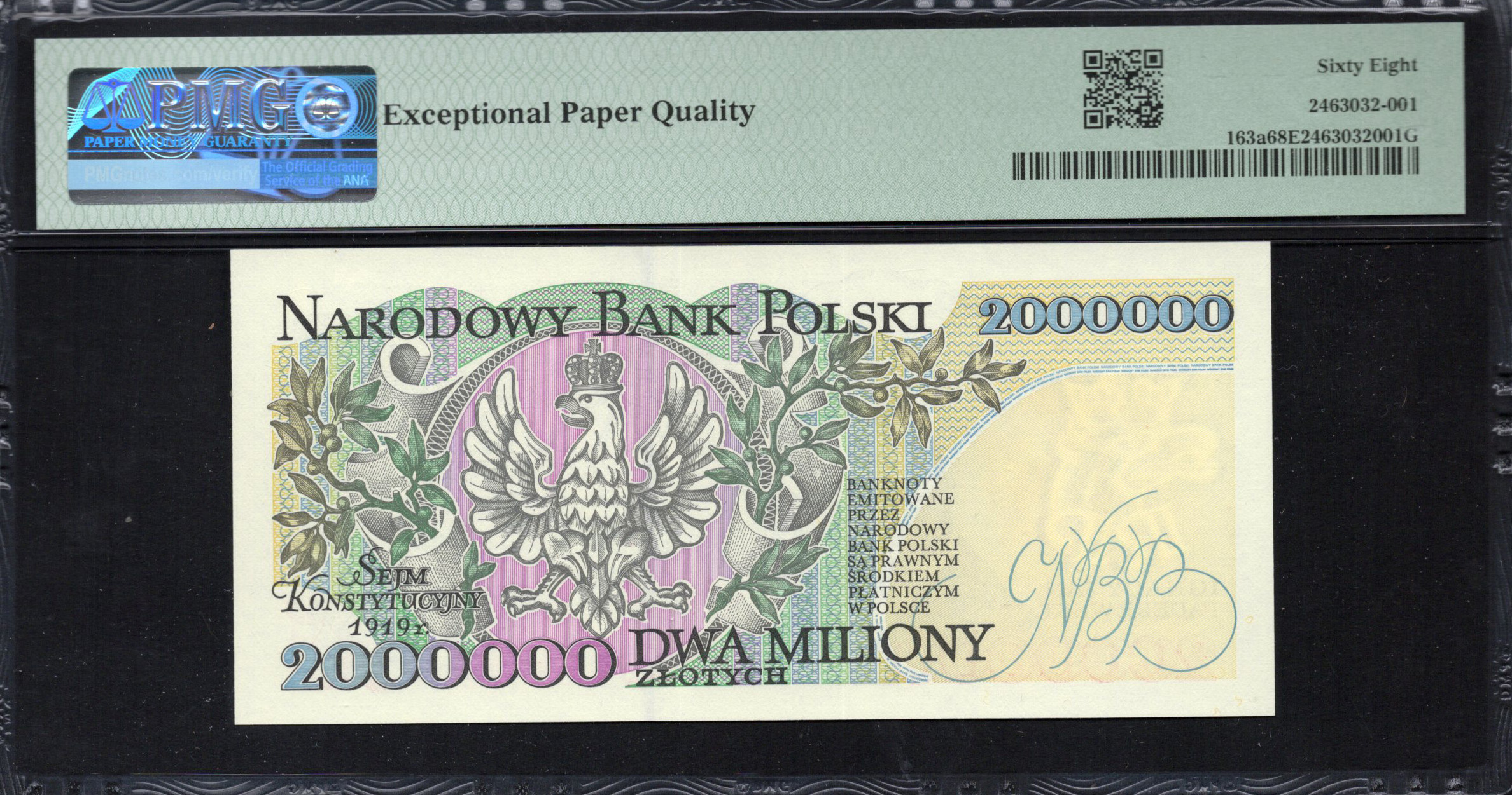Le revers du billet présente les armoiries polonaises de manière proéminente au centre, servant de symbole national et renforçant la signification culturelle du billet. La dénomination '2.000.000' ainsi que le texte 'DWA MILIONY ZŁOTYCH' sont artistiquement intégrés dans des dessins ornementaux riches, ajoutant à la grandeur. L'utilisation de plusieurs couleurs—principalement des rouges vifs, des verts et des bleus—crée un aspect dynamique. Des caractéristiques de sécurité telles qu'une fenêtre transparente et des éléments holographiques sont également présentes, assurant la sécurité du billet contre les contrefaçons. La combinaison de l'art et de la sécurité fait de ce billet non seulement une monnaie, mais aussi un morceau d'identité polonaise.