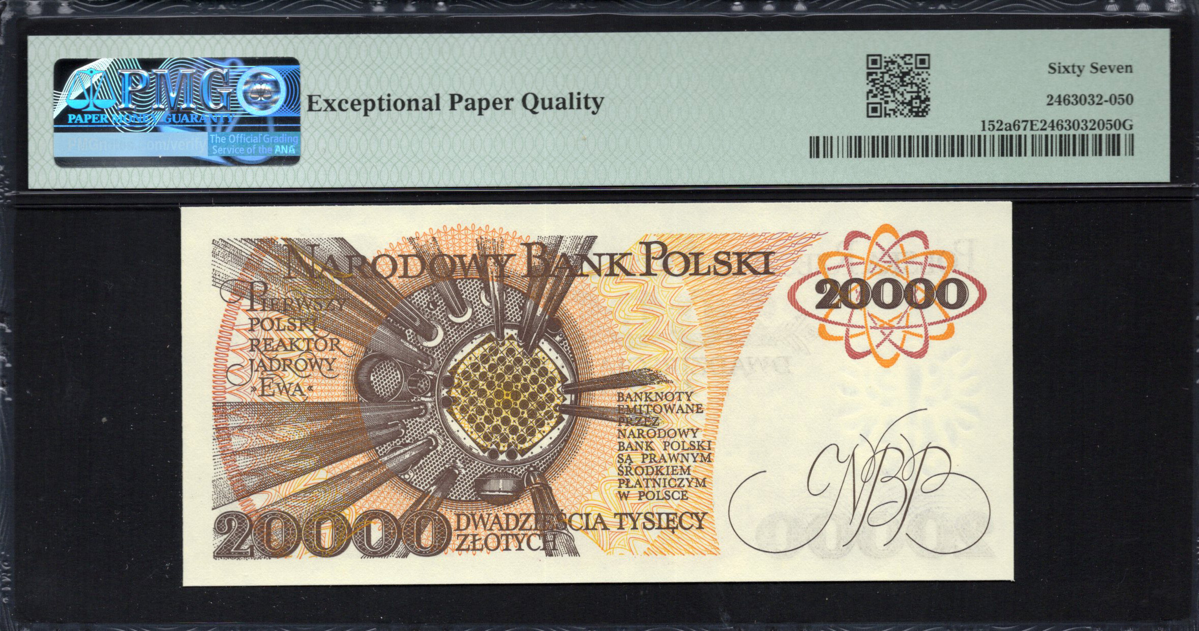 L'arrière du billet présente un design complexe reflétant le patrimoine polonais et l'importance culturelle de la monnaie. Il inclut la dénomination en grands chiffres et présente des éléments ornementaux qui augmentent sa complexité visuelle. La palette de couleurs est principalement composée de teintes chaudes, complétant le design de l'avant. Les caractéristiques de sécurité au dos peuvent comprendre des motifs de lignes fines et, potentiellement, une impression sécurisée qui n'est visible que sous des conditions d'éclairage spécifiques. Dans l'ensemble, l'arrière renforce l'authenticité du billet tout en célébrant le contexte historique de la Pologne.
