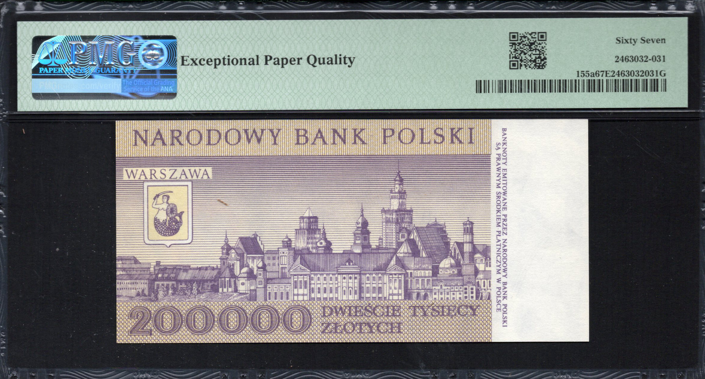 Le verso du billet élabore sur le thème du design géométrique avec des motifs complexes, complétés par une palette de couleurs mettant en avant des tons profonds de violet et de brun. Il présente la ville émettrice, Varsovie, ainsi que la date '1 GRUDNIA 1989.' L'ensemble du design n'est pas seulement esthétiquement attrayant, mais intègre également des éléments de sécurité avancés, y compris des hologrammes et des microimpressions qui sont difficiles à reproduire. Les motifs distincts et les variations de texture servent à la fois des objectifs esthétiques et fonctionnels, illustrant les avancées de la Pologne en matière de conception de billets de banque.