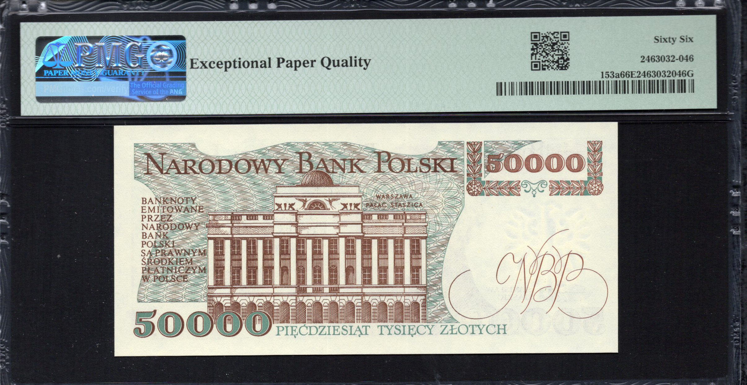 L'avant du billet de 50.000 Zlotych montre un portrait détaillé de Stanisław Staszic, une figure emblématique de l'histoire polonaise. L'utilisation de couleurs douces, comme le beige et le vert, se marie harmonieusement avec les motifs de fond complexes. Notablement, le mot 'Polska' est inscrit en haut, ce qui renforce l'identité nationale du billet. La dénomination '50000' est en gras, facilement identifiable et placée stratégiquement pour attirer l'œil. Les caractéristiques de sécurité incluent une micro-impression et des filigranes subtils, améliorant la résistance à la contrefaçon.