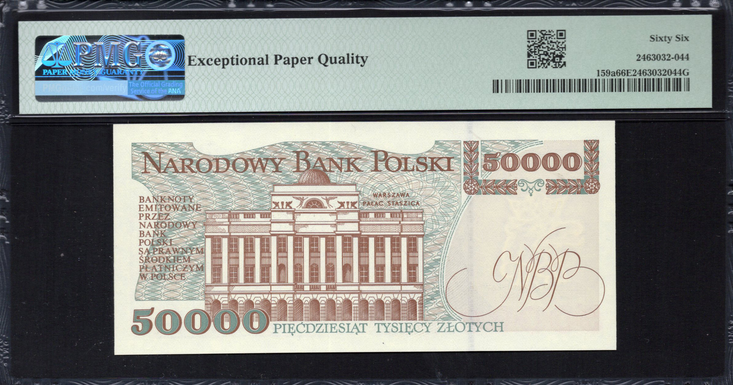 Le recto du billet de 50 000 Zlotys affiche de manière proéminente le visage de Stanisław Staszic, une figure importante de l'histoire polonaise. Les tons de couleur doux – bruns dorés mélangés à des rouges subtils – accentuent la présence de ses traits. Des motifs de fond complexes ajoutent de la profondeur, avec des lignes polies qui attirent l'attention sur la figure centrale. Les caractéristiques de sécurité sont visuellement intégrées, en mettant l'accent sur le filigrane stratégiquement placé, ainsi que sur la micro-impression reflétant l'authenticité du billet. Les yeux de la figure semblent engager le spectateur, créant un élément de confiance et de familiarité.
