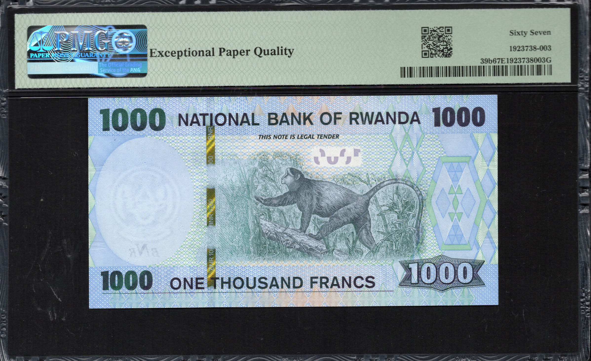 Au verso du billet, une représentation artistique de maisons traditionnelles rwandaises est affichée. Cette image reflète le patrimoine architectural de la région et symbolise la stabilité et le foyer. L'arrière-plan est enrichi de motifs géométriques qui contribuent à l'attrait esthétique et aux caractéristiques de sécurité. La présence d'un grand '1000' renforce la valeur du billet, tandis qu'un filigrane subtil offre une sécurité supplémentaire. L'utilisation réfléchie des couleurs et des motifs favorise un sentiment de fierté nationale, incarnant l'esprit du Rwanda dans chaque détail du design.