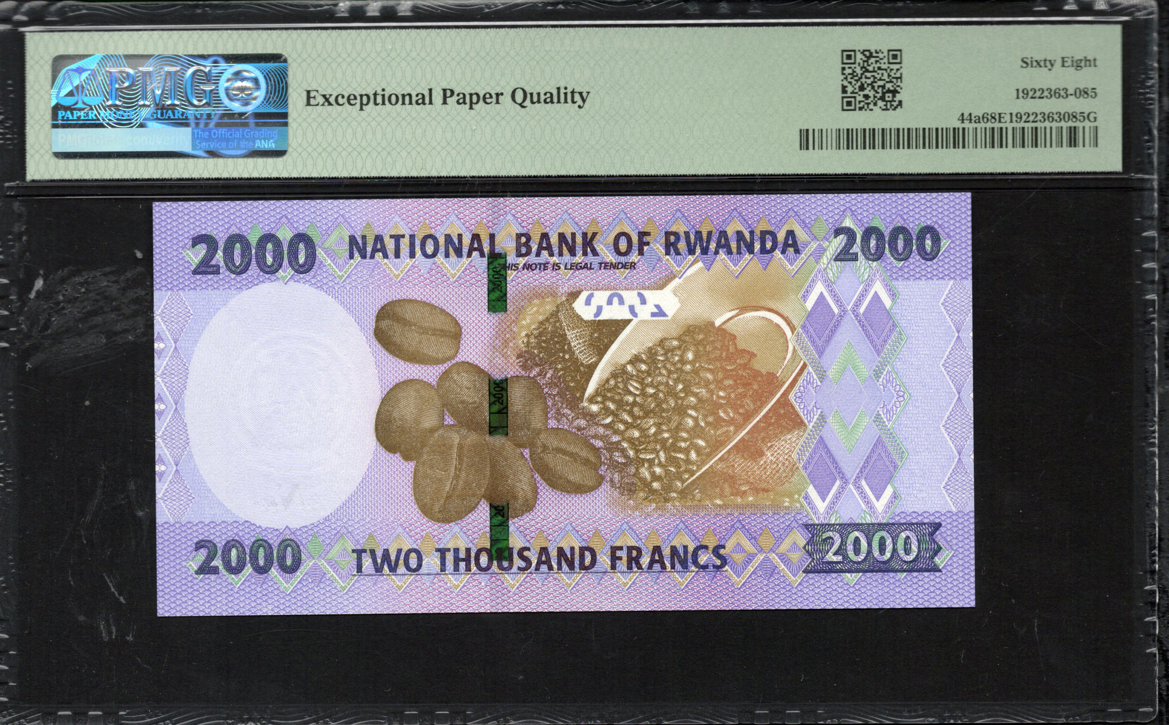 Le billet de 2000 Francs du Rwanda, émis par la Banque Nationale du Rwanda, met en valeur le paysage vibrant et le patrimoine culturel du pays. Ce billet comporte des designs complexes et des caractéristiques de sécurité pour prévenir la contrefaçon. Le recto affiche une illustration artistique du paysage rwandais, complétée par une microécriture et un filigrane qui renforcent sa sécurité. Avec une palette de couleurs allant du violet au bleu, ce billet représente à la fois la beauté et l'économie du Rwanda.