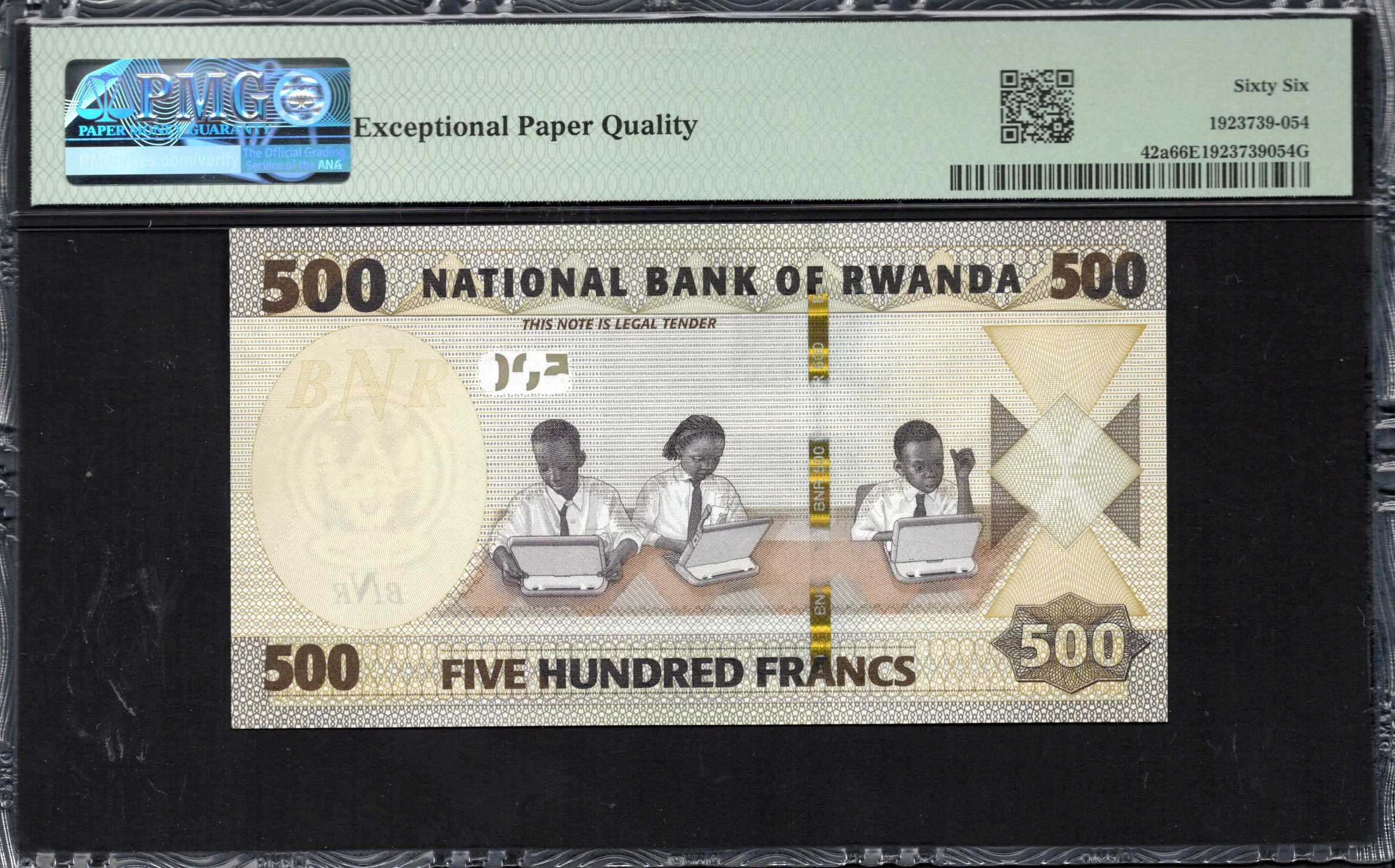 L'avant du billet de 500 Francs rwandais arbore des images vibrantes du paysage unique du Rwanda, mettant en valeur les contours gracieux des collines et de la végétation. La dénomination '500' est visiblement mise en avant, accentuée par des teintes dorées. En dessous, les mots 'AMAFARANGA MAGANA ATANU' affirment la valeur du billet en Kinyarwanda. Les éléments de design supplémentaires comprennent une microécriture et une bande holographique sophistiquée, mettant en avant des caractéristiques de sécurité avancées. Le design de fond intègre des motifs complexes, augmentant l'attrait esthétique tout en servant de mesure anti-contrefaçon.