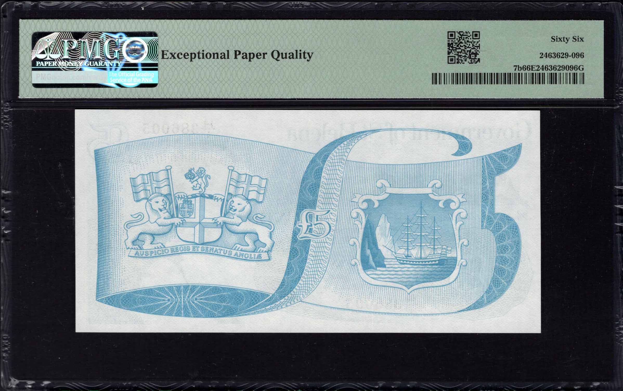 L'avant du billet affiche de manière proéminente un portrait de la reine Elizabeth II, entouré de représentations artistiques de la côte escarpée de Sainte-Hélène. Les couleurs sont principalement en nuances de bleu, avec des détails en rose pour rehausser l'attrait esthétique. La dénomination 'CINQ LIVRES' est clairement indiquée, tandis que des motifs complexes et un numéro de série unique sont intégrés dans le design. Des caractéristiques de sécurité notables, telles qu'un filigrane et une microscripture, sont généralement présentes sur de tels billets pour prévenir la contrefaçon.