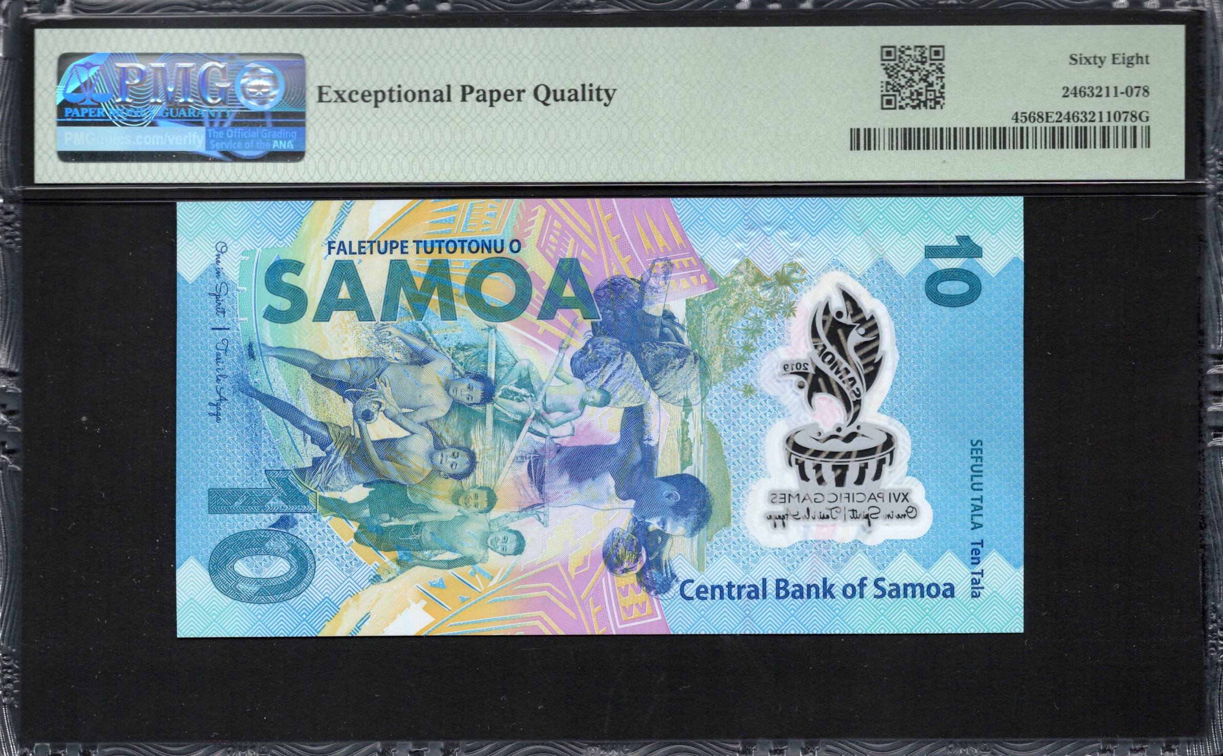 Au verso, le billet conserve son schéma de couleurs vives, présentant des motifs complexes influencés par des designs culturels samoans. L'inscription 'Central Bank of Samoa' est bien en évidence aux côtés de la dénomination '10'. Des images supplémentaires d'athlètes renforcent le thème de l'esprit sportif et de la communauté. Les caractéristiques de sécurité restent intactes, y compris des éléments holographiques qui changent selon l'angle de vue, aidant à prévenir la contrefaçon tout en améliorant l'attrait visuel. Ce côté complète magnifiquement le recto en célébrant l'identité et le patrimoine samoans.