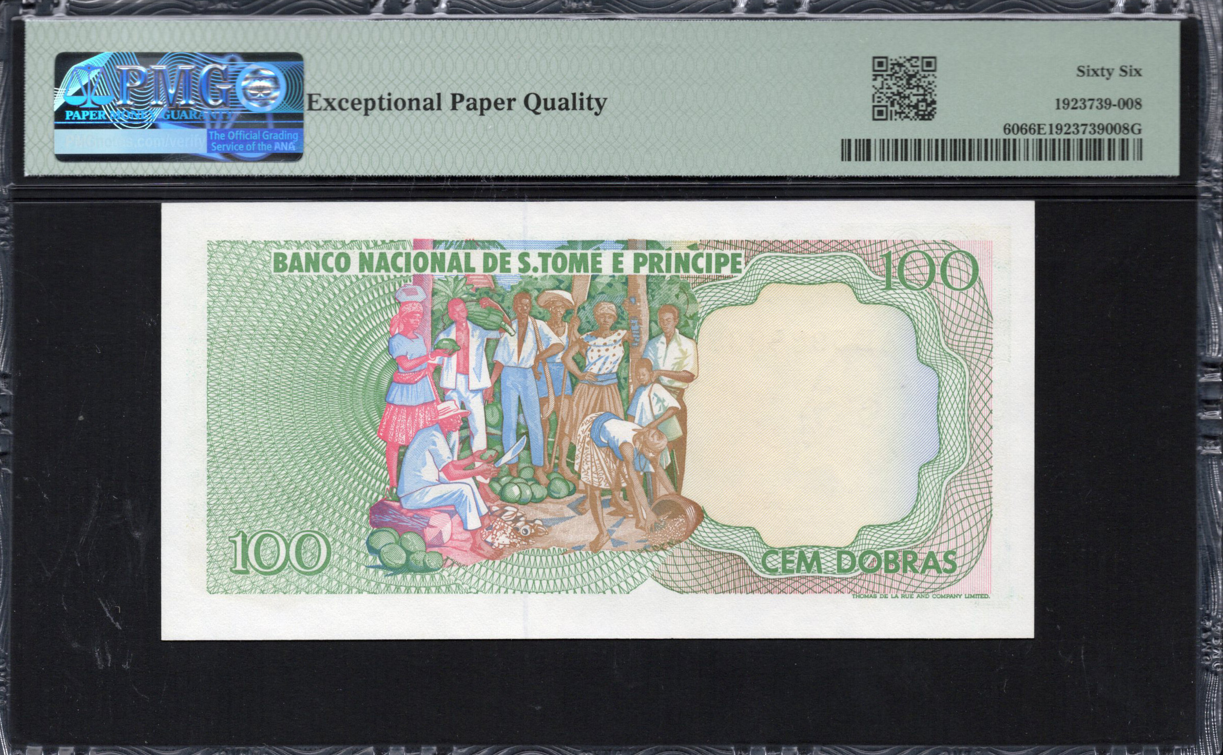 Le recto du billet de 100 Dobras met en avant le profil d'une figure historique importante, symbole de la fierté de São Tomé et Príncipe. Autour de ce portrait, on trouve des teintes vertes riches et des motifs floraux délicats qui reflètent la beauté naturelle de la région. Le texte 'BANCO NACIONAL' et la dénomination '100' sont clairement indiqués, avec une micro-impression servant de caractéristique de sécurité. Les bordures ornementales enrichissent l'attrait esthétique, contribuant à la vivacité générale du billet.