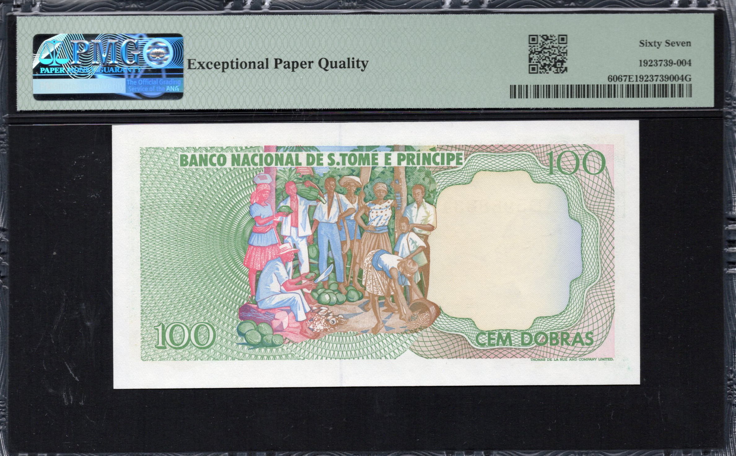 L'arrière du billet poursuit le thème de la beauté naturelle et de la représentation culturelle avec des designs floraux supplémentaires. Les détails complexes des motifs sont caractéristiques de l'art traditionnel souvent trouvé dans la région. Les mots "CEM DOBRAS" et la dénomination de 100 sont présents de manière proéminente, augmentant la fonctionnalité et la reconnaissance. Bien que les caractéristiques anti-contrefaçon spécifiques sur l'arrière soient moins définies, l'ensemble du schéma de couleurs et le design contribuent à créer un billet attractif et cohérent qui incarne l'esprit de São Tomé et Príncipe.