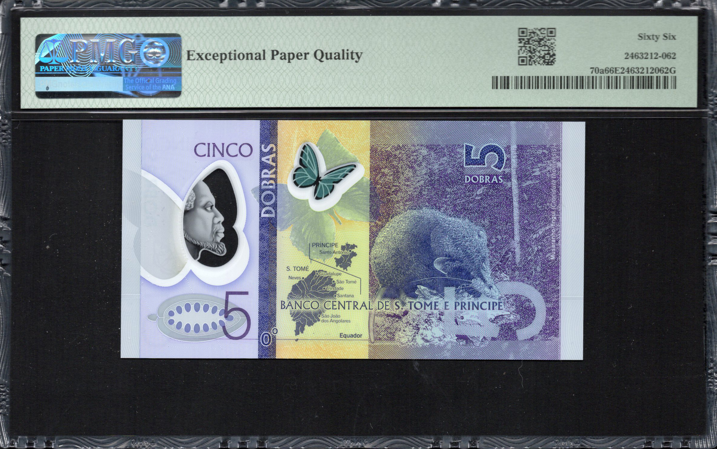 Le recto du billet de 5 Dobras est une exposition frappante de couleurs et d'images. Il présente une illustration proéminente d'un papillon, conçu de manière complexe et rendu dans des teintes bleu-vert vives. L'arrière-plan comprend des éléments du paysage naturel, mélangés à des textures subtiles qui donnent de la profondeur à l'ensemble du design. De plus, la dénomination '5' est clairement marquée, tandis que des motifs complexes et un microtexte servent de caractéristiques de sécurité. Le billet est imprimé sur du polymère, ce qui le rend durable et moins susceptible de s'user.