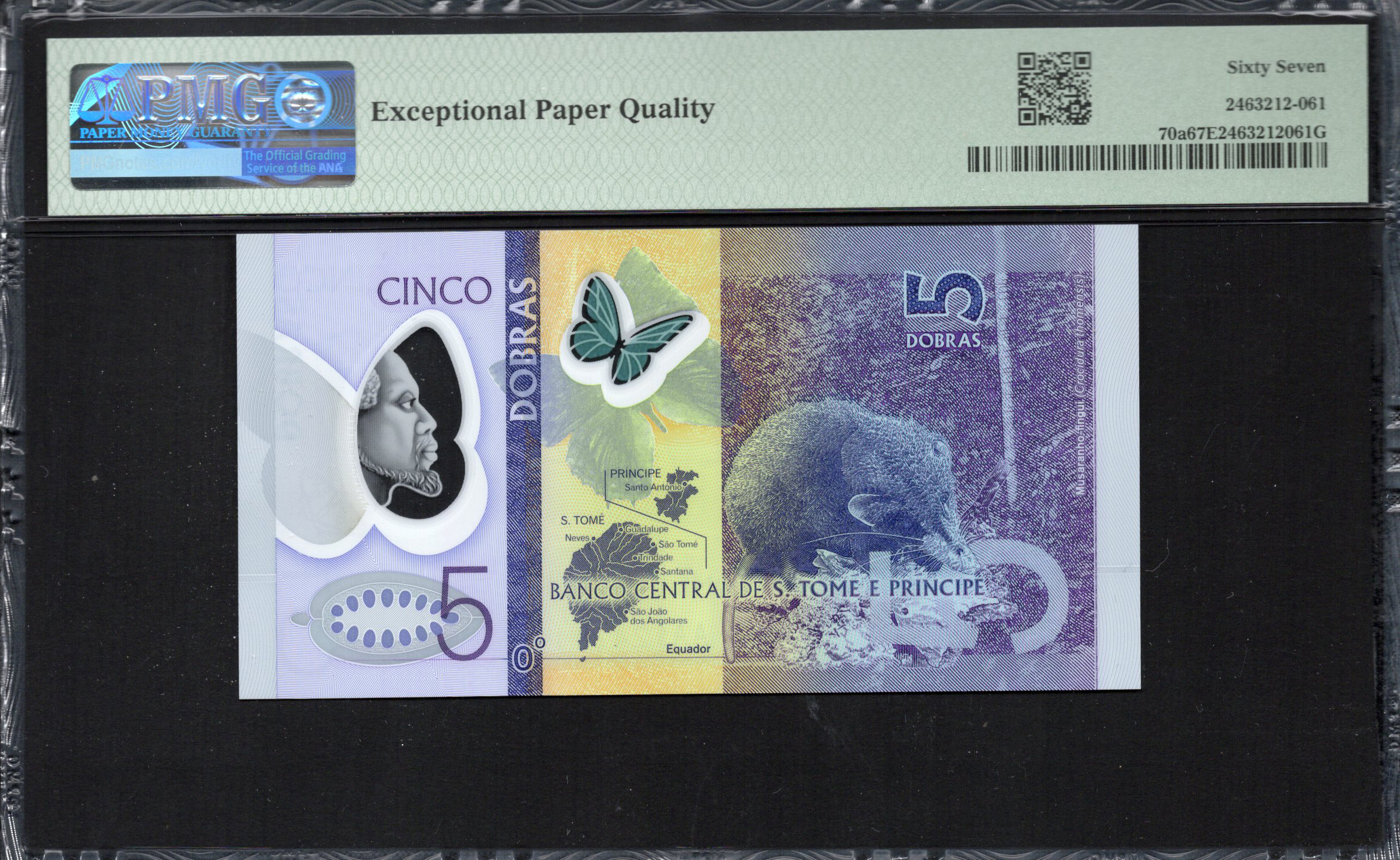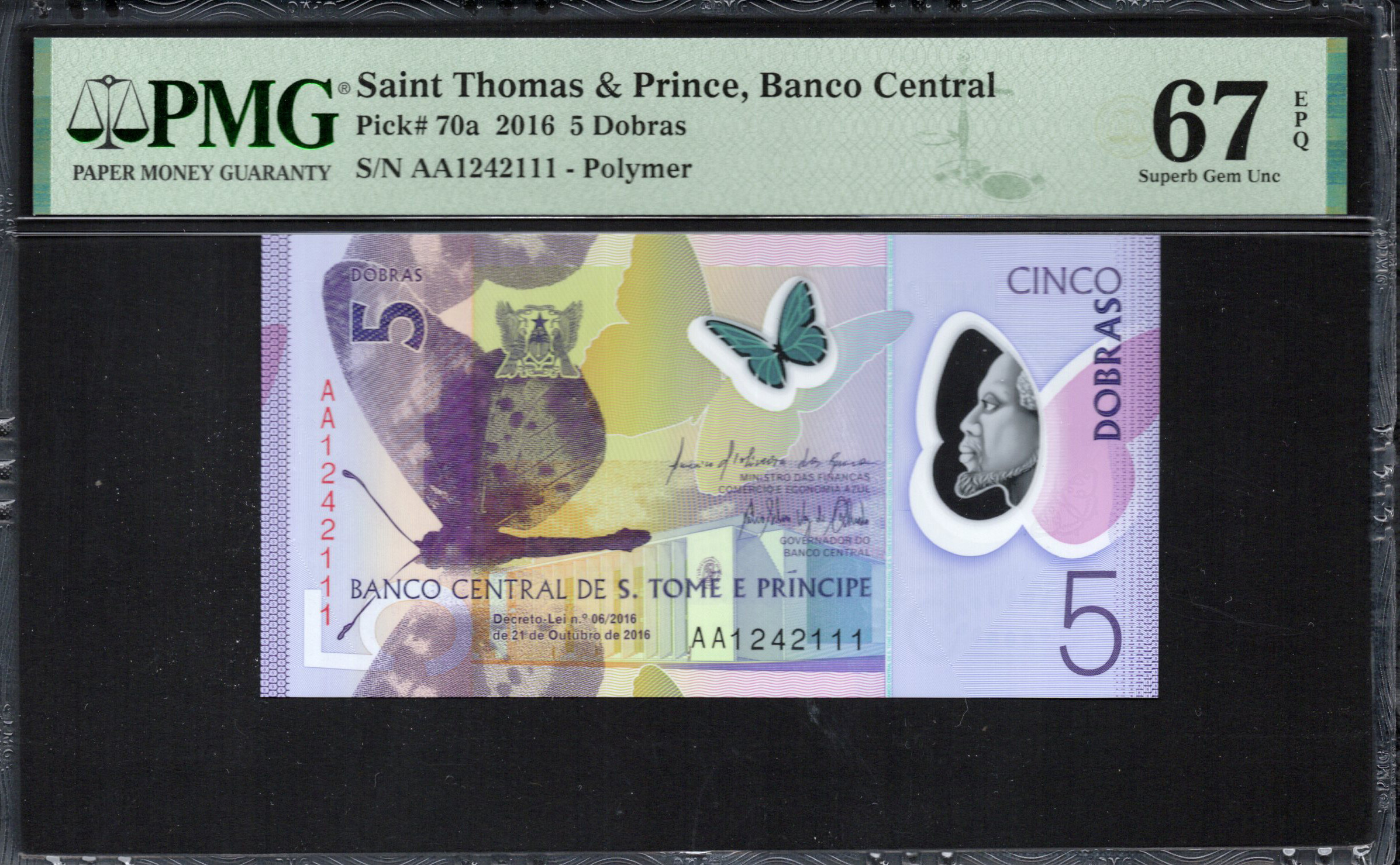 Le verso du billet présente un portrait d'une figure influente de l'histoire de São Tomé et Príncipe, entouré de courbes douces et de couleurs qui résonnent avec le design du recto. L'expression 'CINCO DOBRAS' met en évidence la valeur du billet de manière proéminente. Un petit papillon est affiché aux côtés de motifs décoratifs, fournissant une continuité dans le thème. Les caractéristiques de sécurité telles qu'une bande holographique et des éléments en relief garantissent que le billet respecte les normes de sécurité modernes tout en servant également de points d'accent artistique. La combinaison de couleurs vives, de motifs artistiques et d'éléments de sécurité crée un design complet qui raconte l'histoire de la nation.